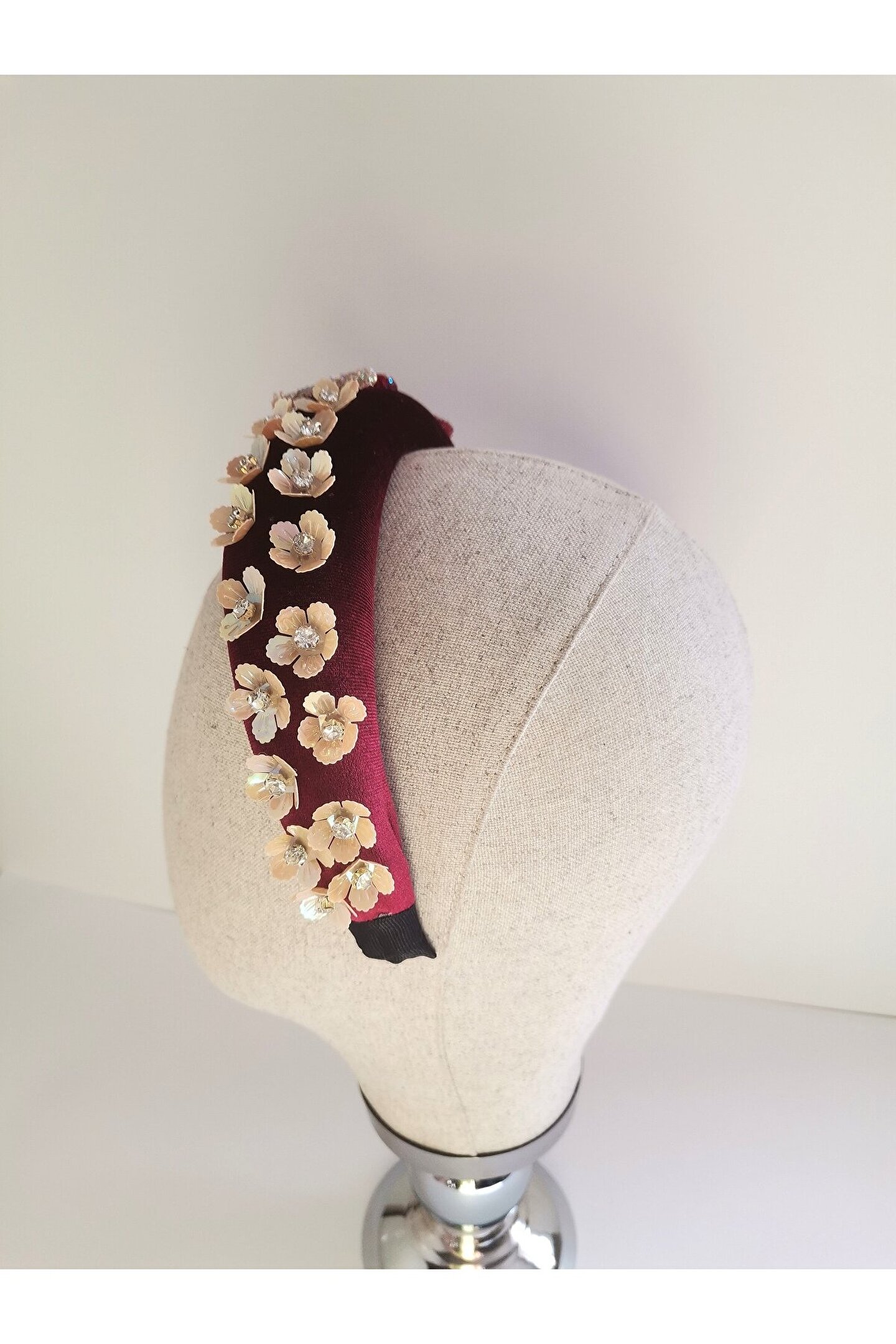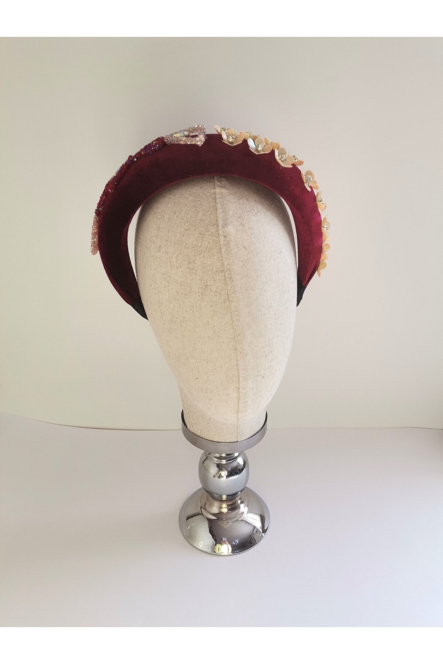 Cemil İpekçi defilesi için özel olarak tasarlanan bu zarif taç, kırmızı kadife kumaşıyla şıklığı ve zarafeti bir araya getiriyor. Bir tarafında çiçek motifli boncuklar ve parlak detaylar, diğer tarafında ise cam ve ışıltılı boncuklarla yapılan işlemelerle süslenmiştir. Özel günlerde veya günlük kullanımlarda stilinize şıklık katacak bu taç, her tarza uyum sağlayarak dikkatleri üzerinize çekecek. Kendinizi özel hissetmek için ideal bir aksesuar!