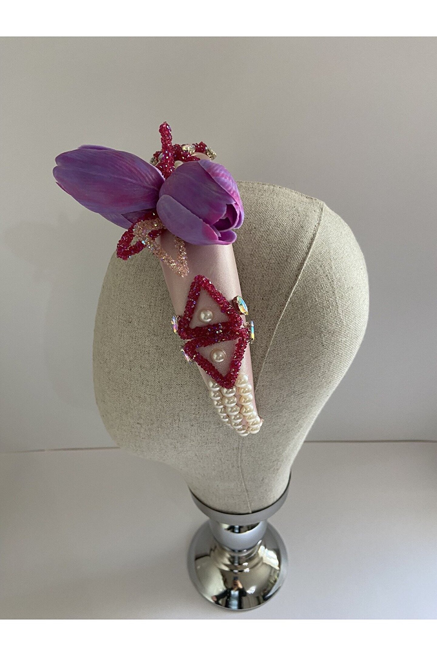 Cemil İpekçi defilesi için özel olarak tasarlanan bu zarif taç, pembe kadife kumaşıyla şıklığı ve zarafeti bir araya getiriyor. Bir tarafında çiçek motifi ve parlak detaylar, diğer tarafında ise cam ve ışıltılı boncuklarla yapılan işlemelerle süslenmiştir. Özel günlerde veya günlük kullanımlarda stilinize şıklık katacak bu taç, her tarza uyum sağlayarak dikkatleri üzerinize çekecek. Kendinizi özel hissetmek için ideal bir aksesuar!