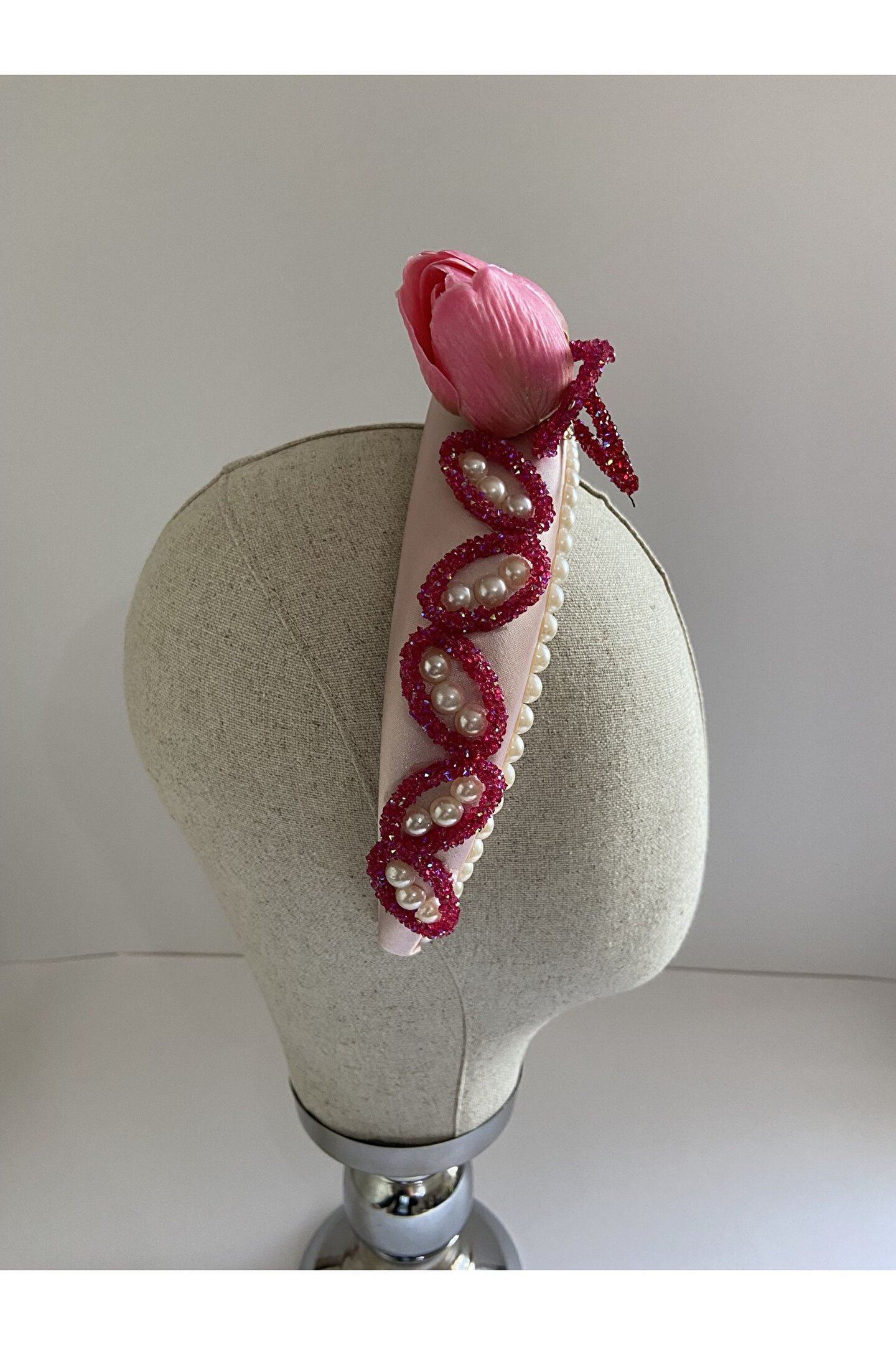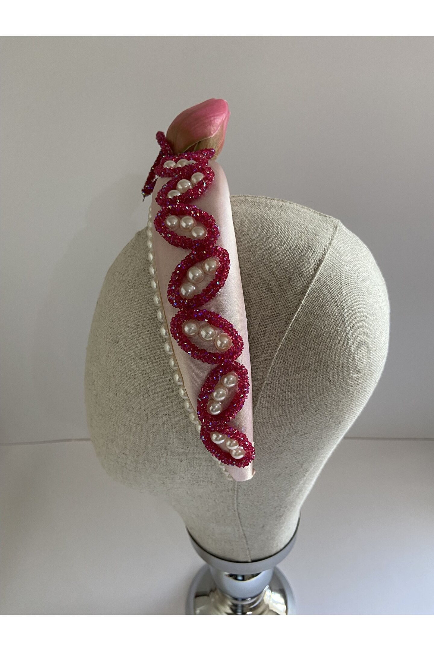 Cemil İpekçi defilesi için özel olarak tasarlanan bu zarif taç, pembe kadife kumaşıyla şıklığı ve zarafeti bir araya getiriyor. Bir tarafında çiçek motifi ve parlak detaylar, diğer tarafında ise cam ve ışıltılı boncuklarla yapılan işlemelerle süslenmiştir. Özel günlerde veya günlük kullanımlarda stilinize şıklık katacak bu taç, her tarza uyum sağlayarak dikkatleri üzerinize çekecek. Kendinizi özel hissetmek için ideal bir aksesuar!
