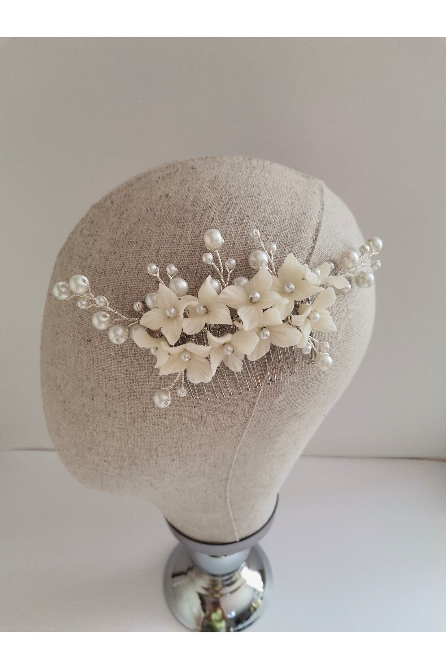 • Çiçek taneleri ve inci boncuklar ile hazırlanmış özel tasarım saç tarağı ve küpe seti.