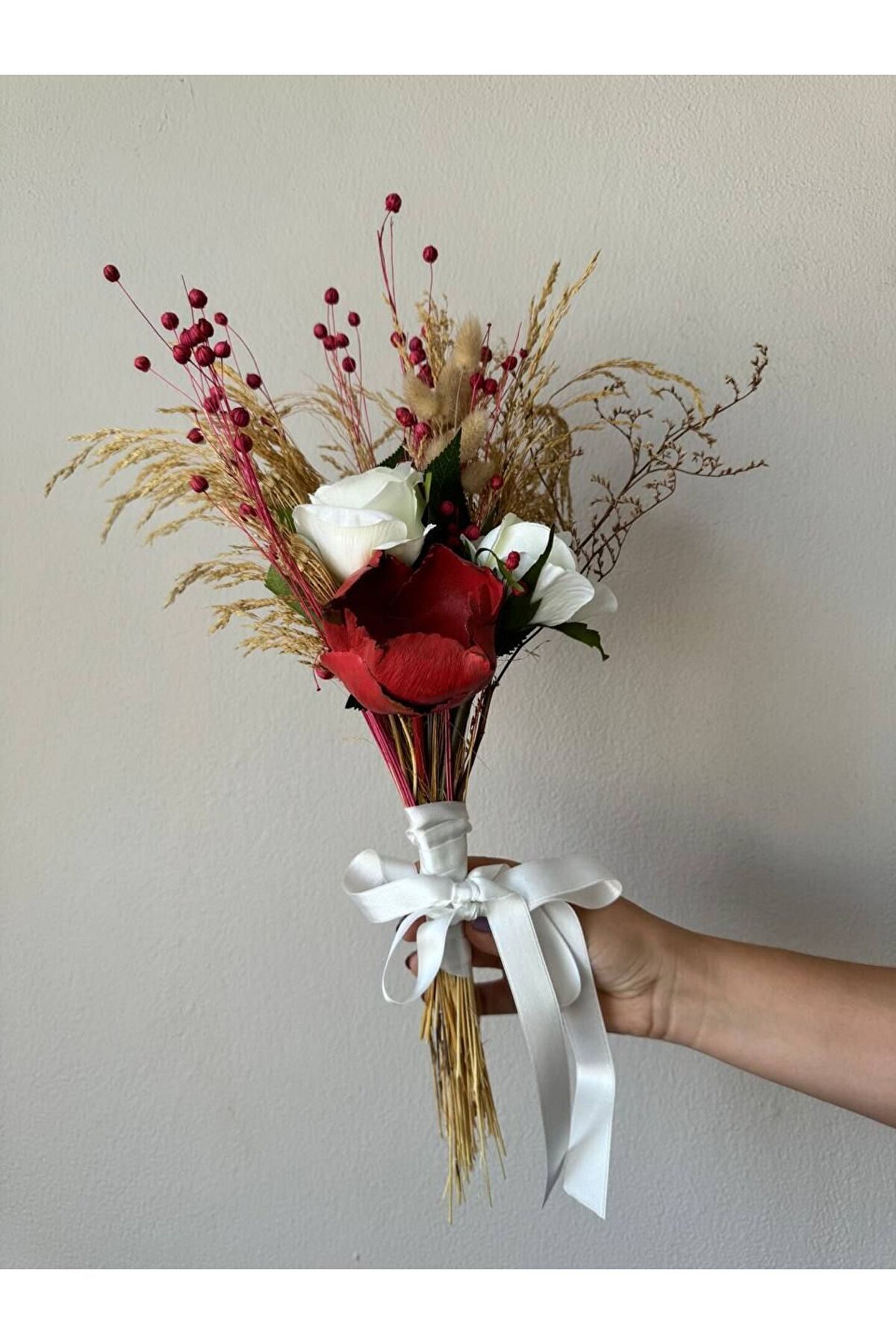 Kuru çiçeklerden oluşan buket, taze ve canlı görünümüyle dikkat çeker; Uzun ömürlü yapısı sayesinde düğün, nişan gibi özel günlerde dekorasyonunuzu tamamlar; Kolayca kurutulmuş ve muhafaza edilmiş çiçekler, uzun süreli kullanım için idealdir; Kuru çiçeklerin dayanıklılığı, buketin estetik görünümünü korumasına yardımcı olur; Kuru çiçeklerin doğal dokusu ve renkleri, mekanınıza sıcak ve samimi bir atmosfer katar;