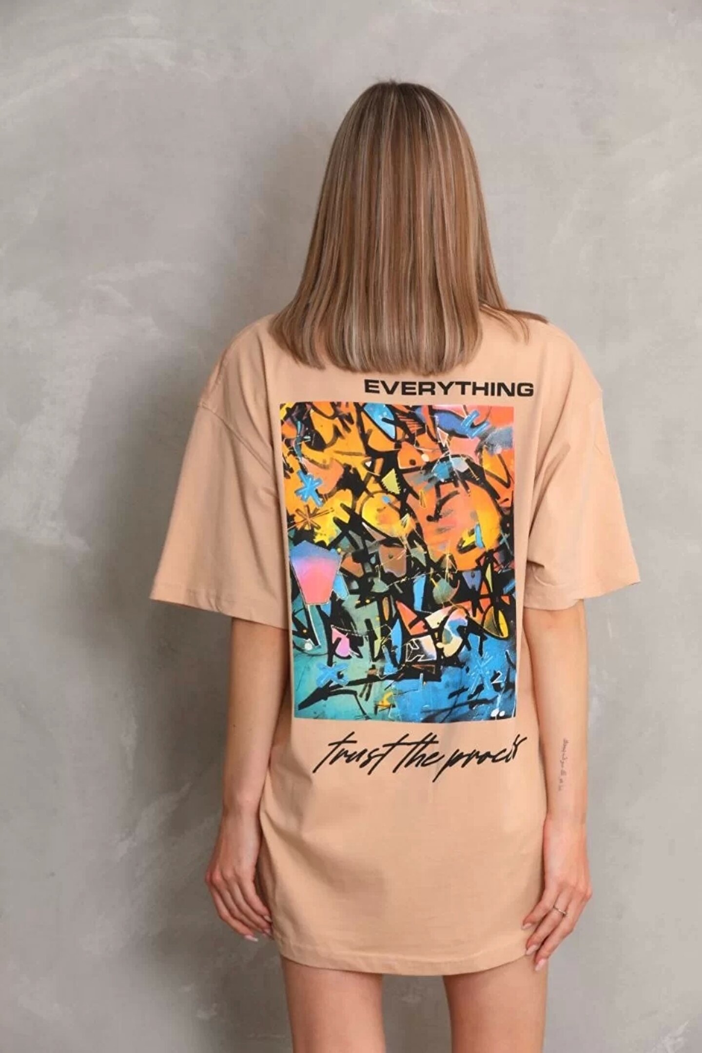 Unisex Bisiklet Yaka Baskılı Oversize T-Shirt - Bej Modelin Ölçüleri: Boy:165, Kg:55, Göğüs:90, Bel:72, Kalça: 100 Modelin üzerindeki ürün M/38 bedendir