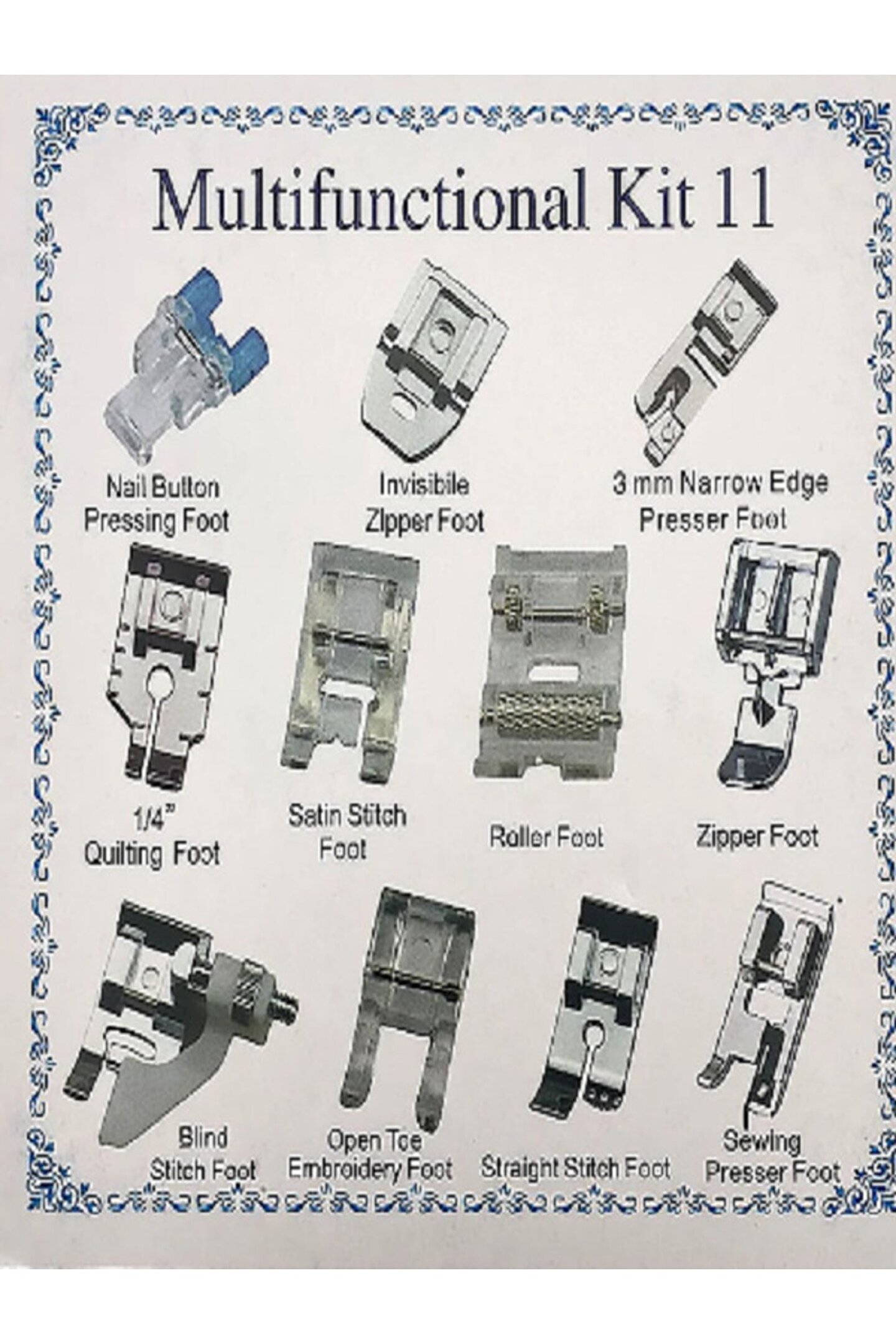 ÜRÜNLER DİKİŞ MAKİNE ÇARŞISI ORİJİNAL ÜRÜNLERİDİR. ; SİNGER BEKO ZETİNA BROTHER JUKI GİBİ bir çok ev tipi Aile Makinaları ile uyumludur. ; Sanayi tipi dikiş makineleri, eski tip dikiş makineleri ve mini tip dikiş makineleri ile uyumlu değildir. ; PAKET İÇERİĞİ 1. ; KIVIRMA AYAĞI 2. ; GİZLİ DİKİŞ AYAĞI 3. ; GİZLİ FERMUAR AYAĞI 4. ; ŞEFFAF BASKI AYAĞI 5. ; PLASTİK BASKI AYAĞI 6. ; DERİ DİKME AYAĞI 7. ; FERMUAR AYAĞI 8. ; SÜLFİLE AYAĞI 9. ; PATCHWORK AYAĞI KALIN 10. ; PATCHWORK AYAĞI İNCE 1 1. ; DÜĞME DİKME AYAĞI;