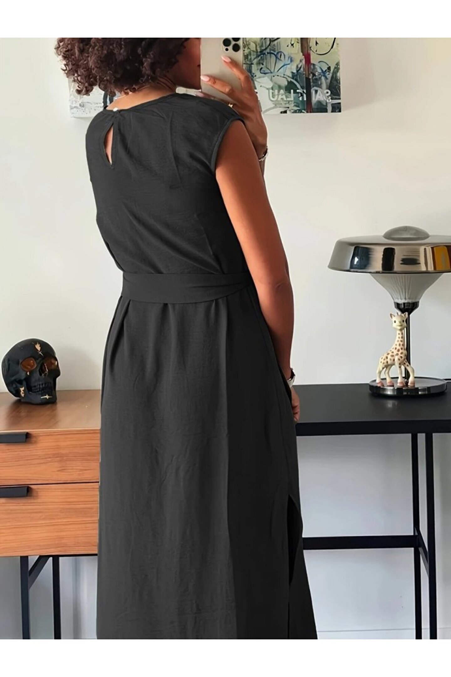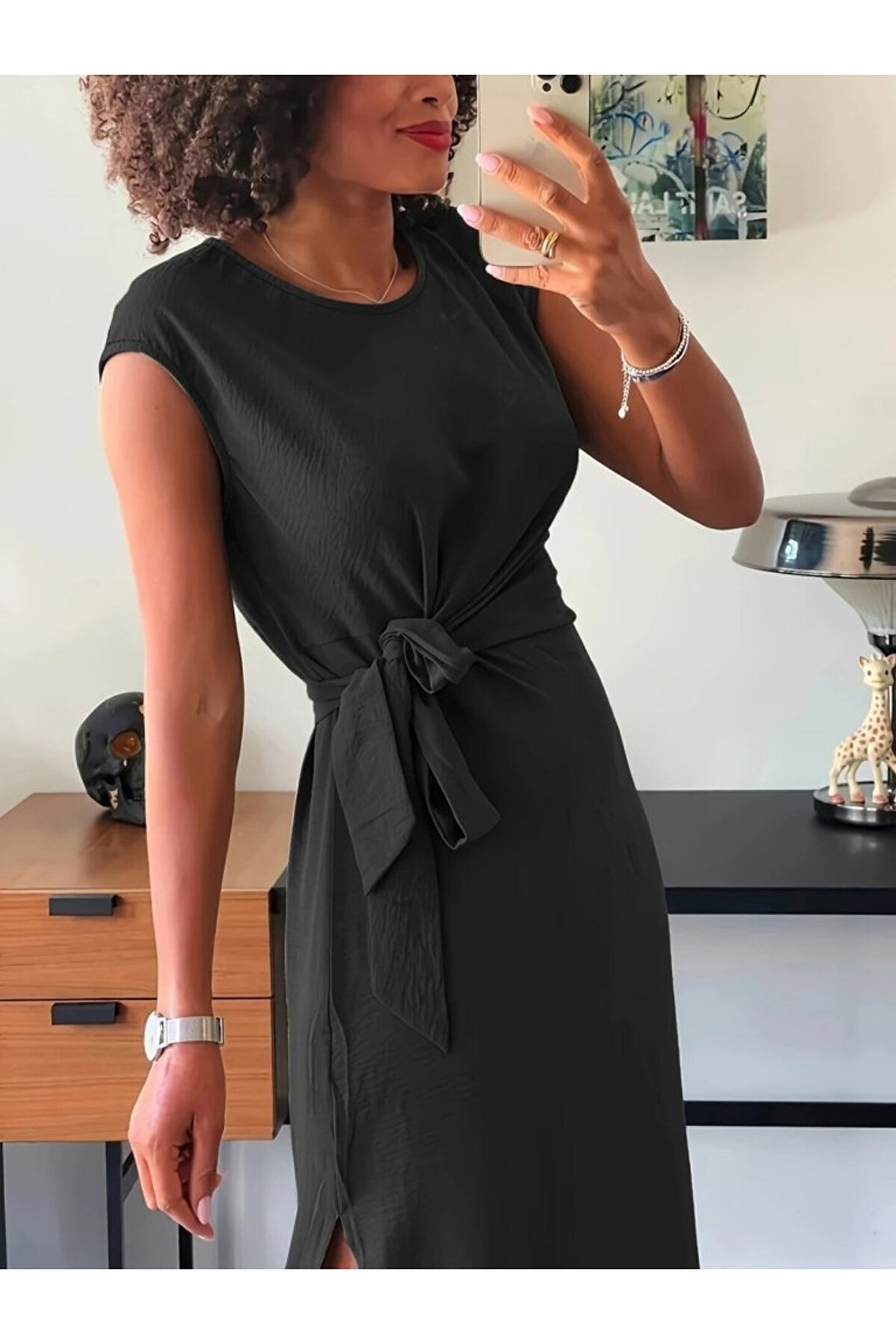 BÜŞRA TEZEL MODA MODAVERA Kadın Kısa Kollu Yuvarlak Yaka Belden Bağcıklı önden Yırtmaçlı Aerobin Elbise