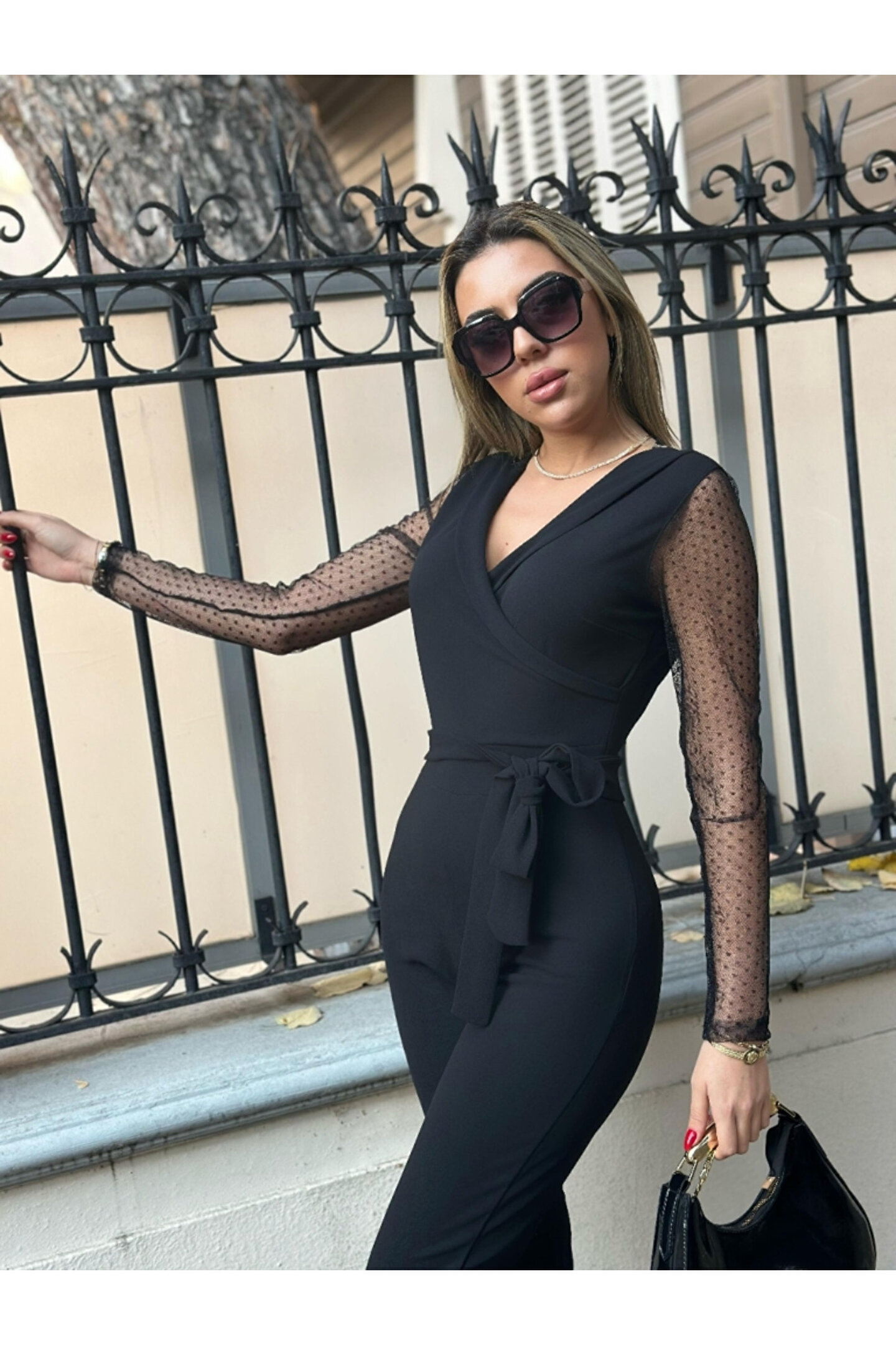 Butik Aura Mou EQURİ Kadın Uzun Kollu Kruvaze Yakalı Kolları Tül Detay Beli Kuşaklı Ithal Krep Tulum