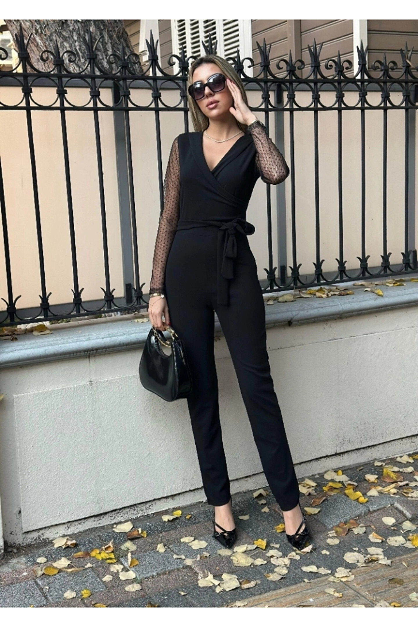 Butik Aura Mou Kadın Uzun Kollu Kruvaze Yakalı Kolları Tül Detay Beli Kuşaklı Ithal Krep Tulum