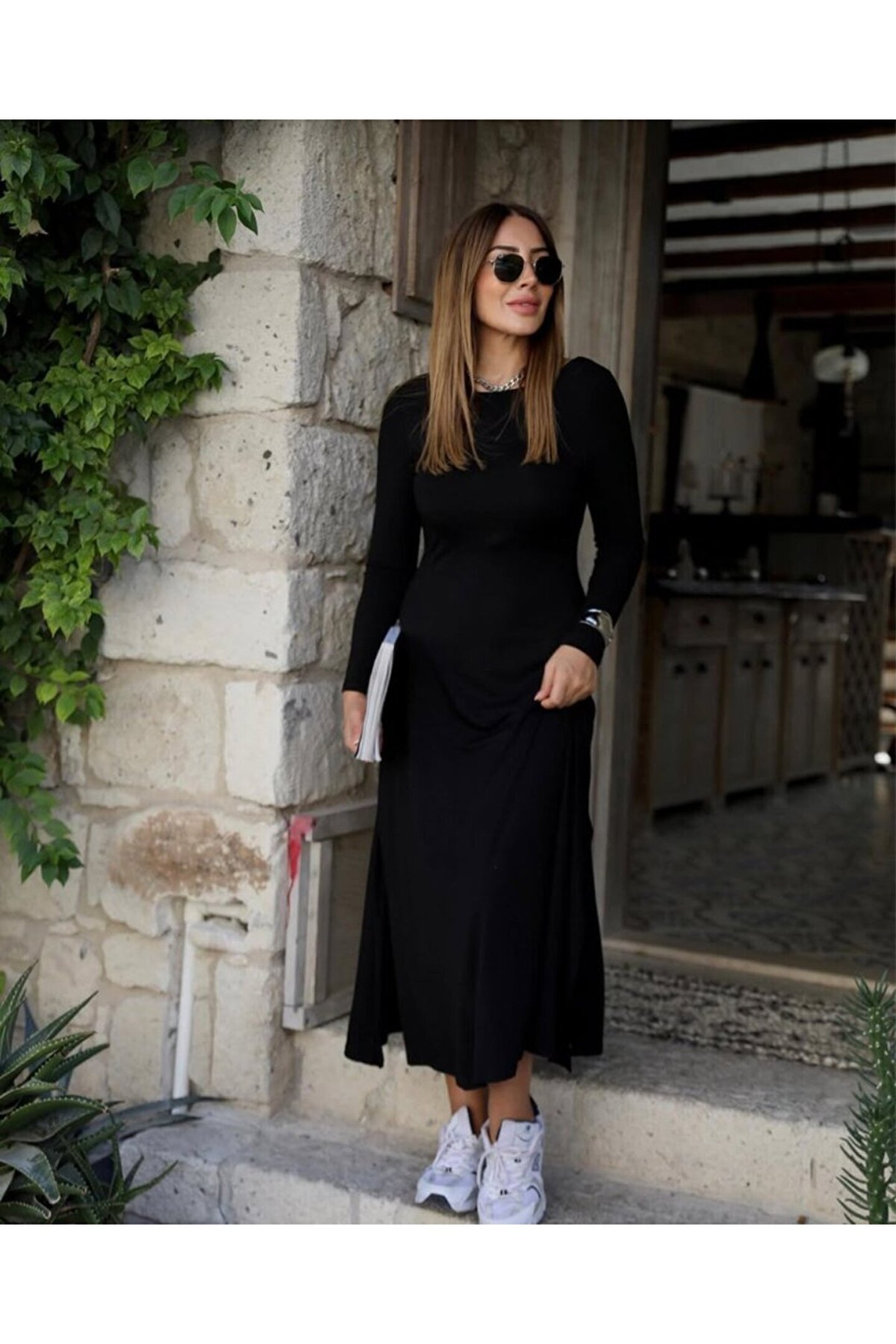 Butik EQURİ Kadın Uzun Kollu Bisiklet Yaka Arkası çapraz Detaylı Viskon Iki Iplik Maxi Elbise