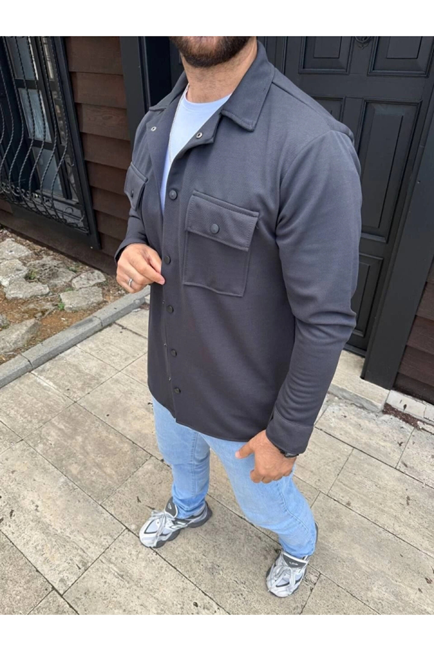 Butik Erkek Diagonal Kumaş Cepli Çıtçıtlı Uzun Kollu, Gömlek Oversize Rahat Kalıp Günlük Şık Stil - Füme
