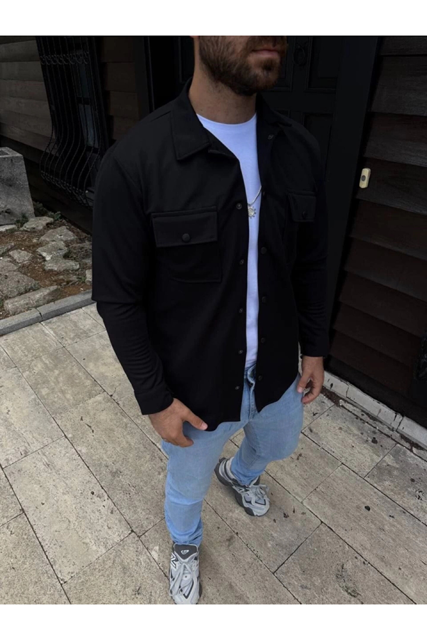 Butik Erkek Diagonal Kumaş Cepli Çıtçıtlı Uzun Kollu, Gömlek Oversize Rahat Kalıp Günlük Şık Stil - Siyah