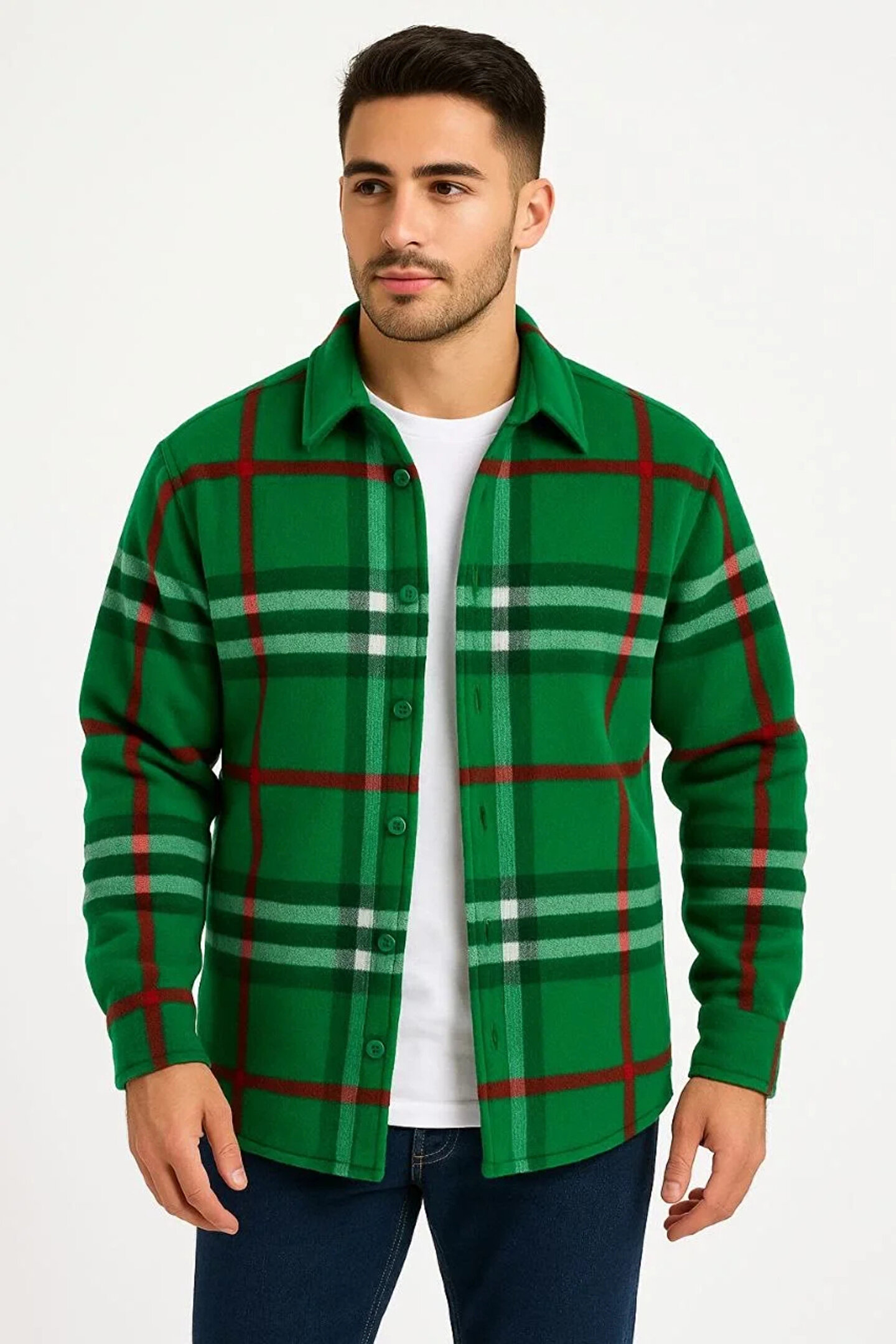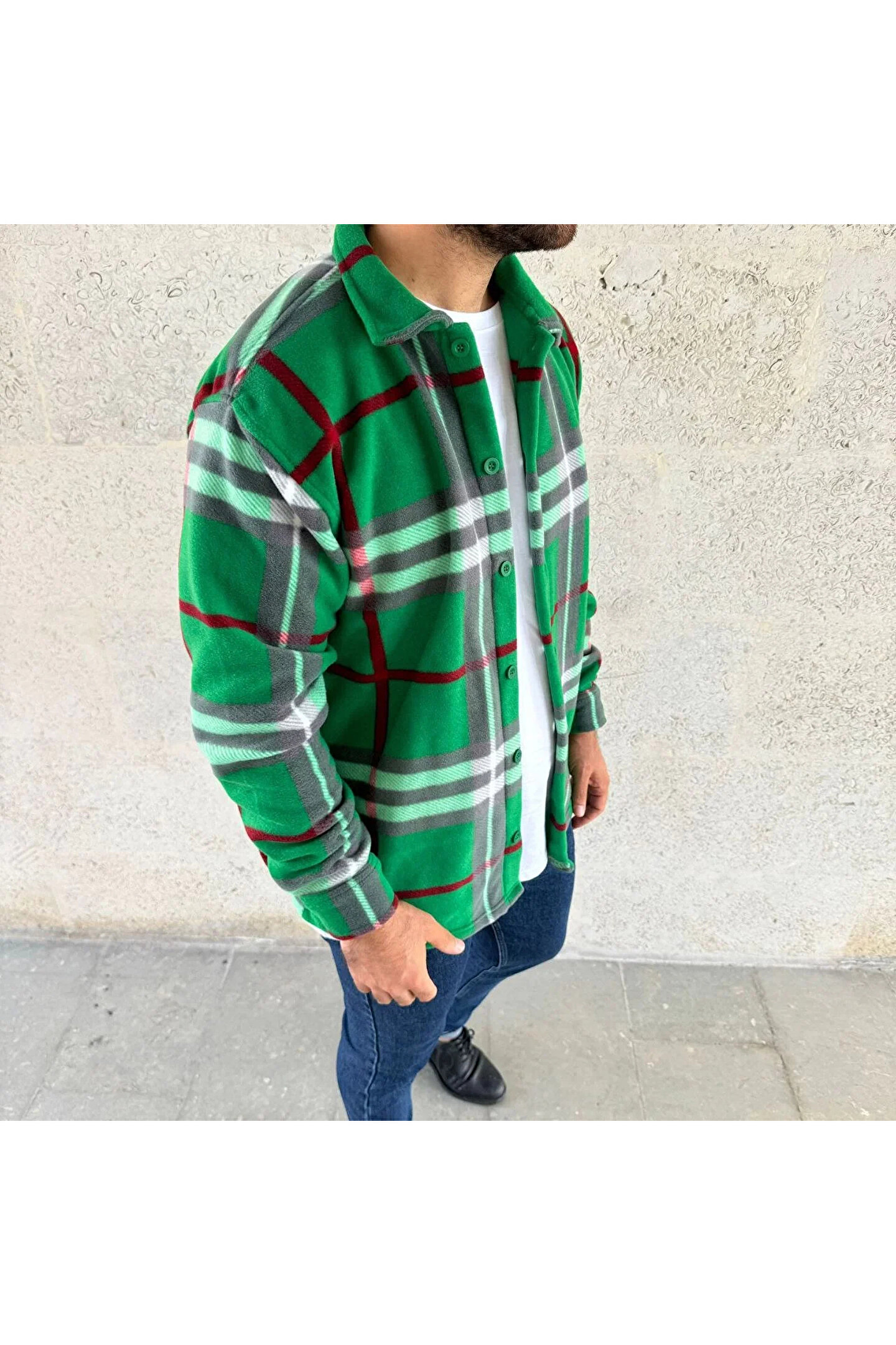 Butik Erkek Ekose Desenli Düğmeli Polar Yakalı Uzun Kollu Gömlek Oversize Rahat Kalıp - Yeşil