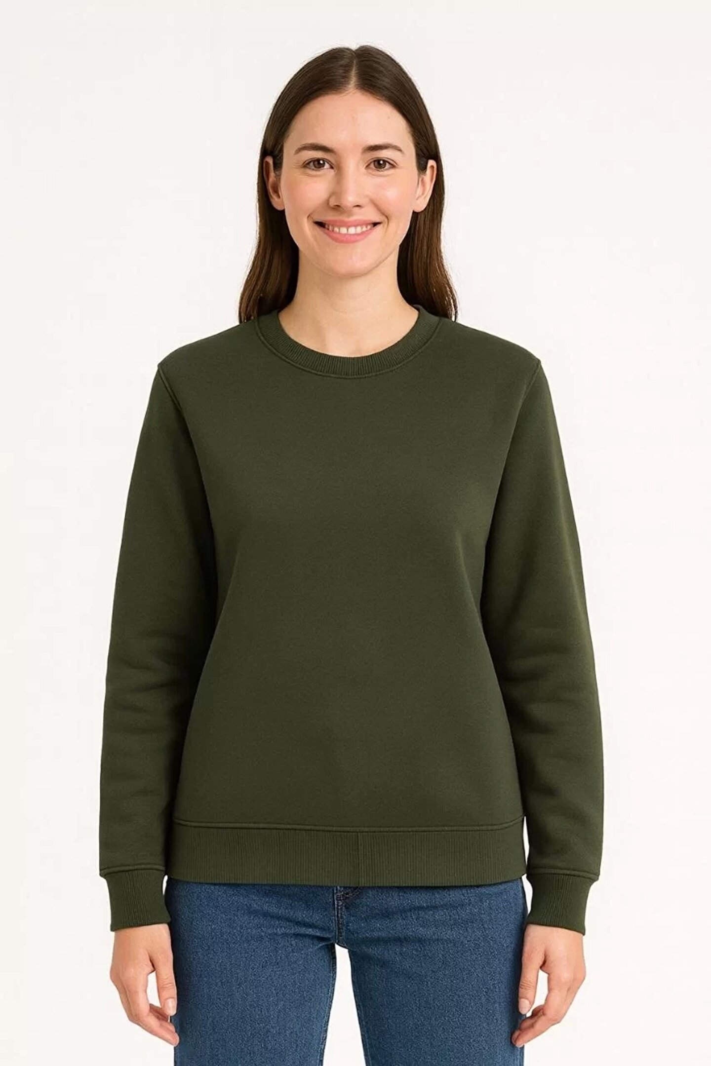 Butik Kadın Üç İplik Düz Bisiklet Yaka SweatShirt - Haki