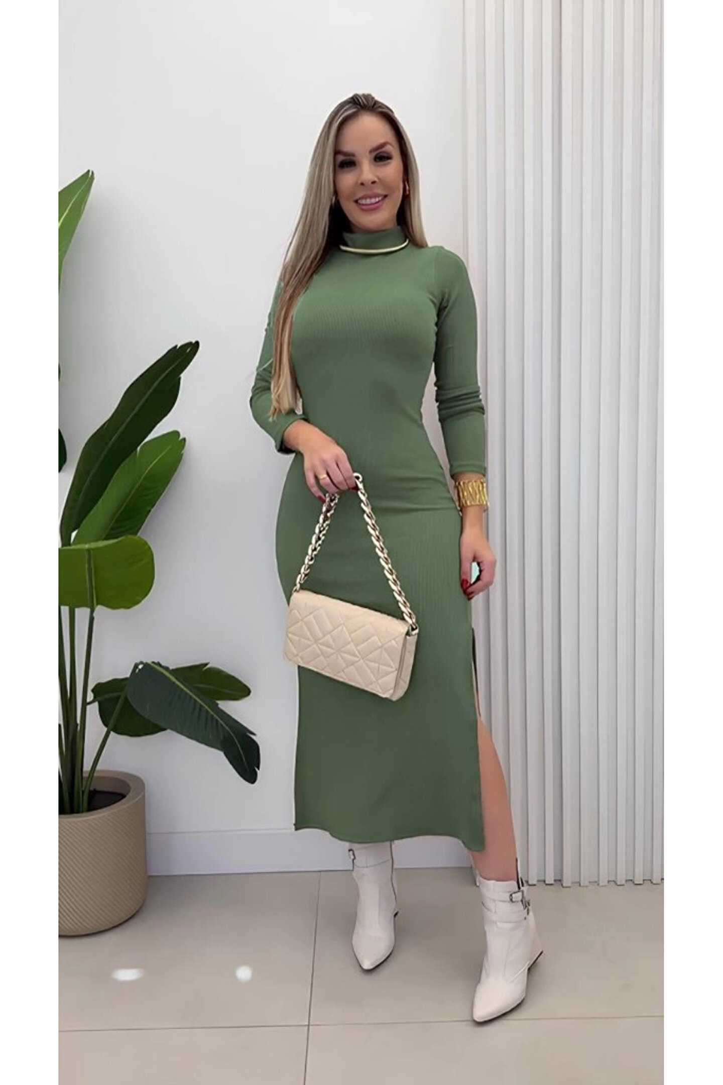 Kadın Uzun Kollu Balıkçı Yakalı Yanlardan Yırtmaçlı Kaşkorse Maxi Elbise
