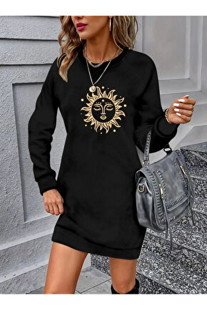 Kadın Uzun Kollu Bisiklet Yaka Güneş Desenli Viskon Iki Iplik Elbise