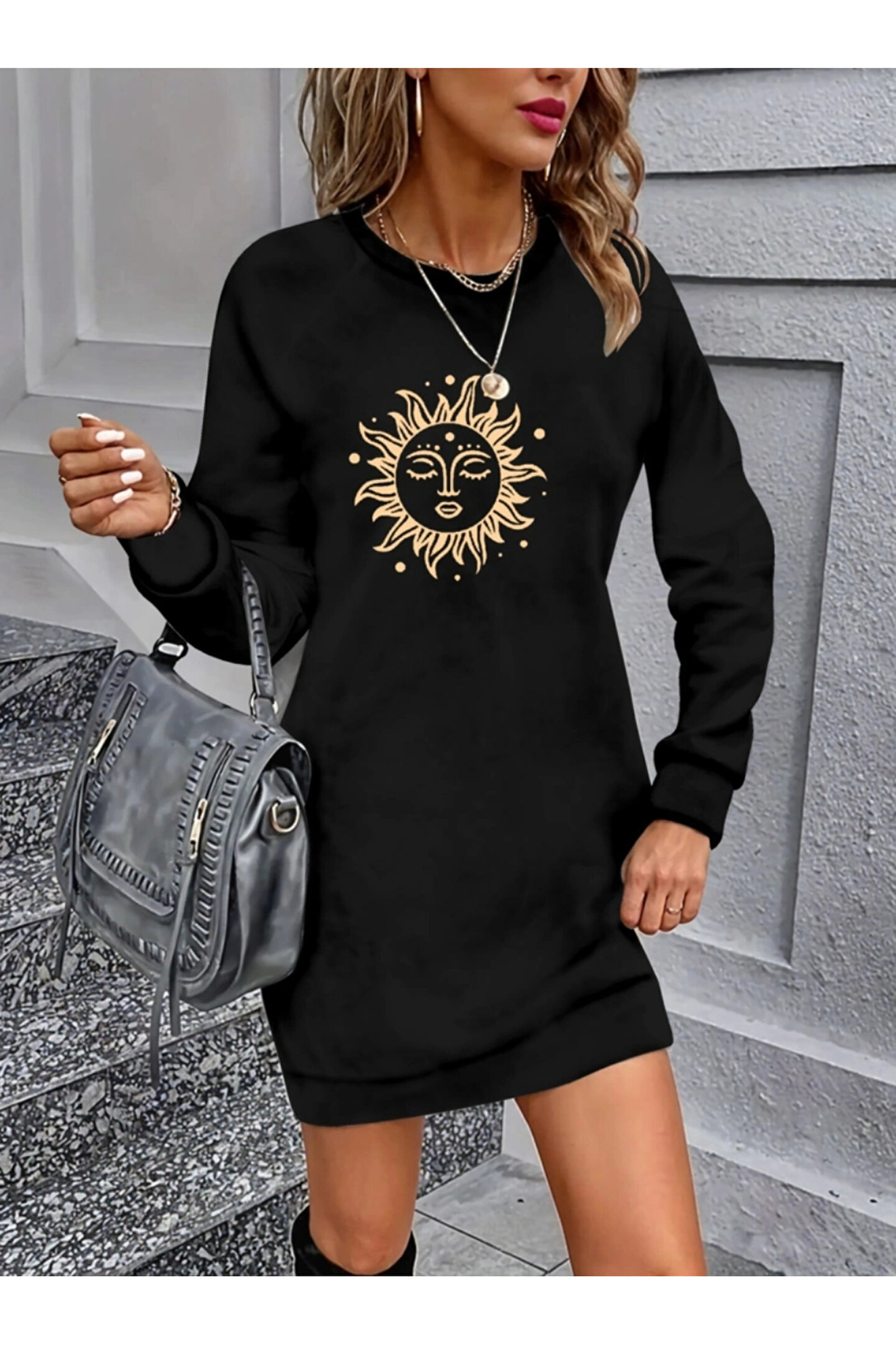 Butik Kadın Uzun Kollu Bisiklet Yaka Güneş Desenli Viskon Iki Iplik Elbise