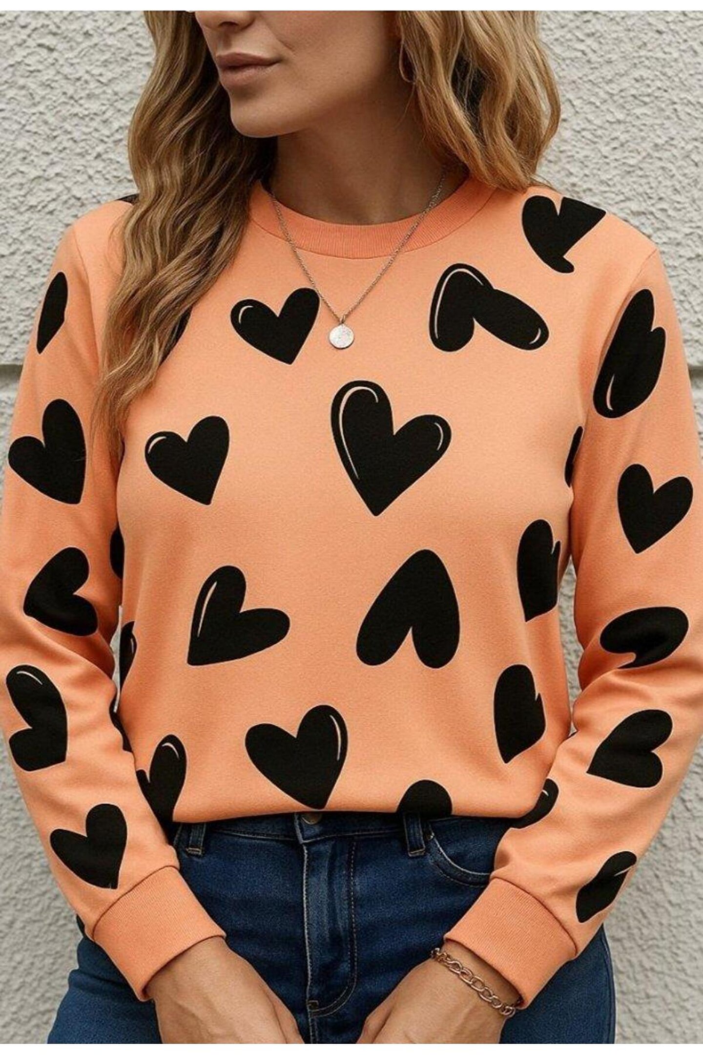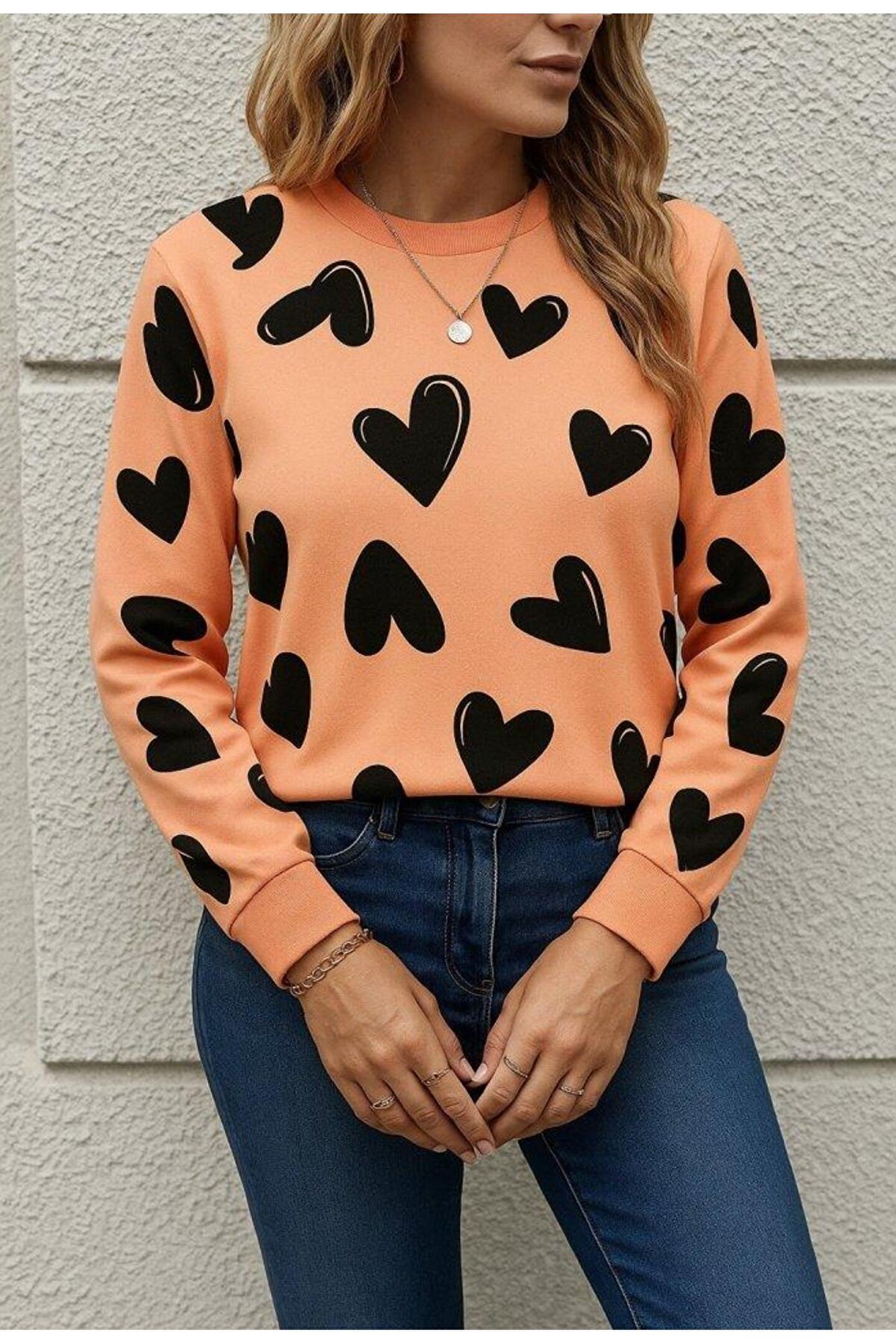Kadın Uzun Kollu Bisiklet Yaka Kalp Desenli Iki Iplik Bluz