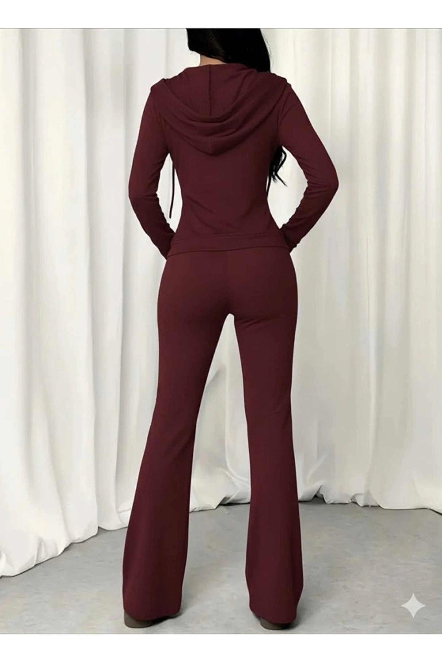 Butik Kadın Uzun Kollu Kapşonlu Bağcıklı önü Fermuarlı Viskon Iki Iplik Bluz Ve Pantolon Ikili Takım