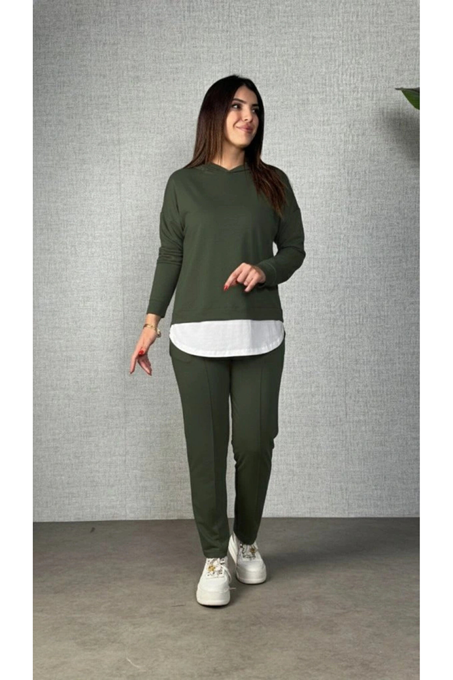 Butik Kadın Uzun Kollu Kapşonlu Bağcıklı Viskon Iki Iplik Bluz Ve Pantolon Ikili Takım