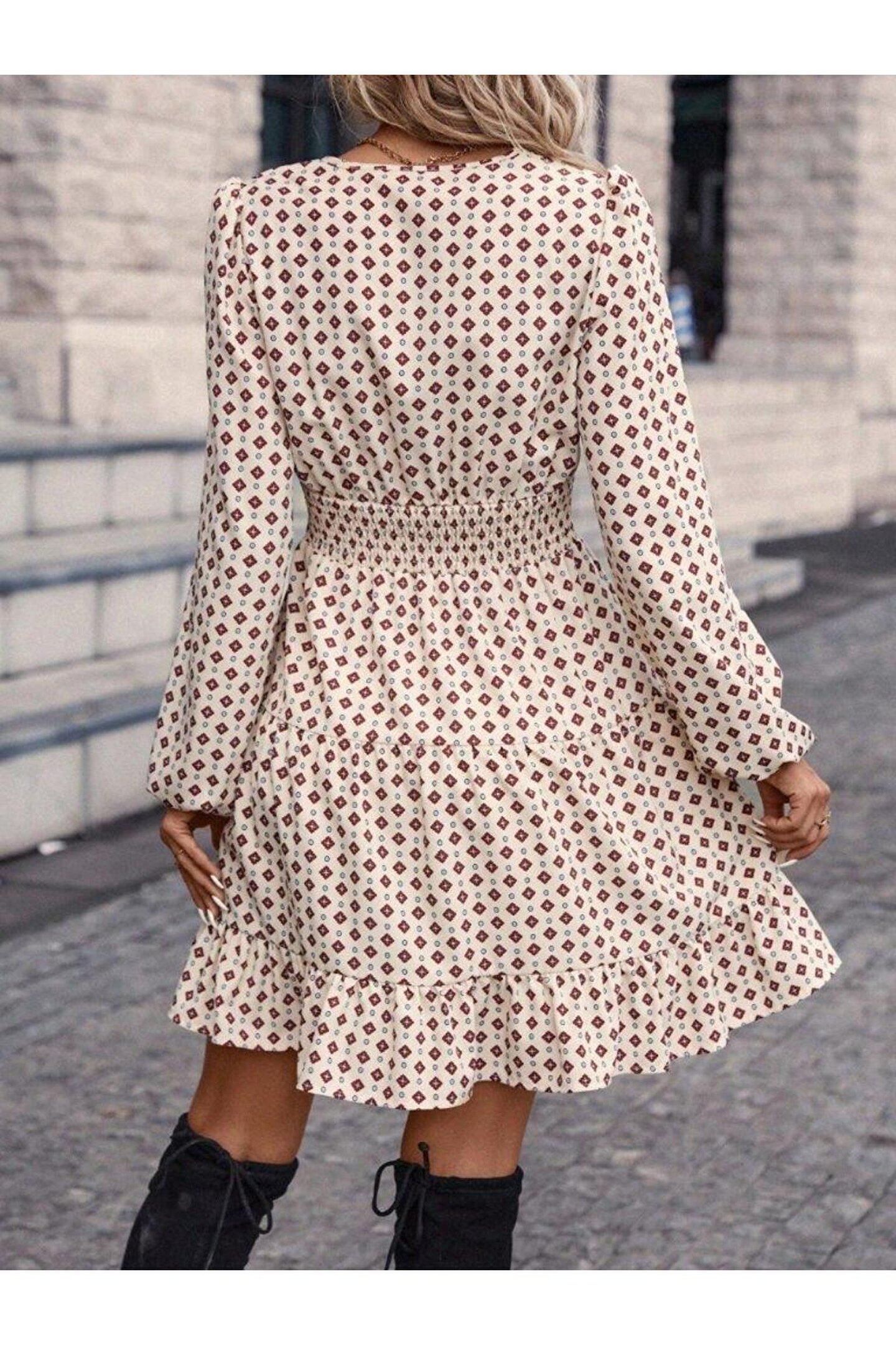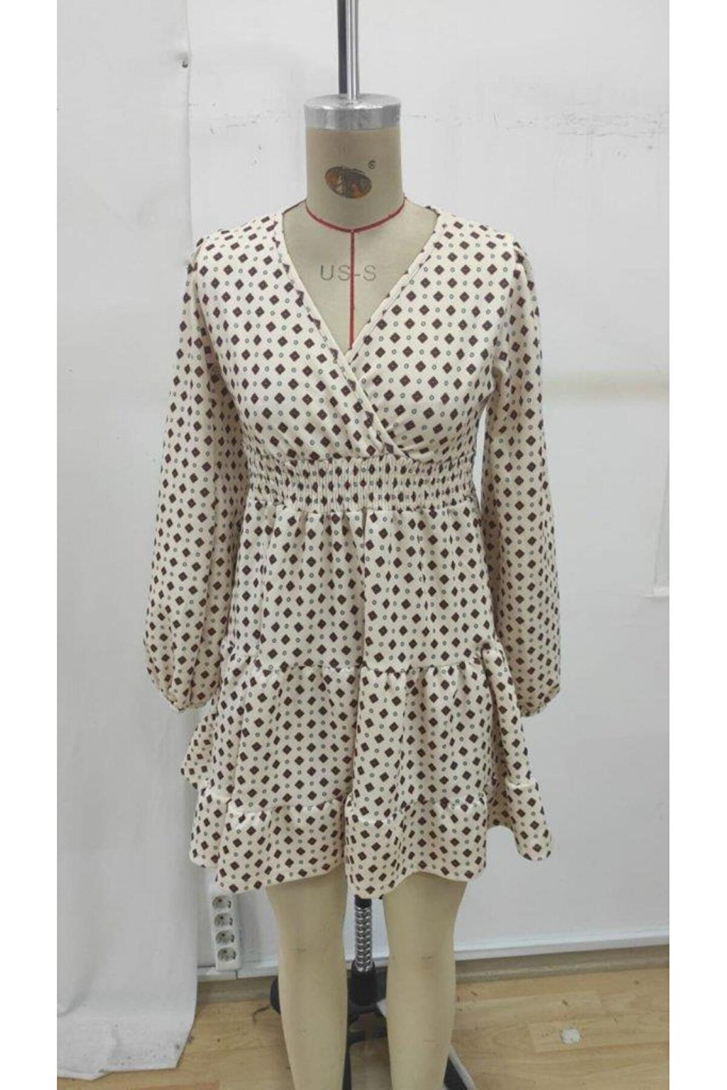 Butik Kadın Uzun Kollu Kruvaze Yaka Desenli Mini Modal Elbise