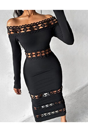 Butik Kadın Uzun Kollu Madonna Dantel Yaka Yırtmaçlı Midi Dalgıç Elbise