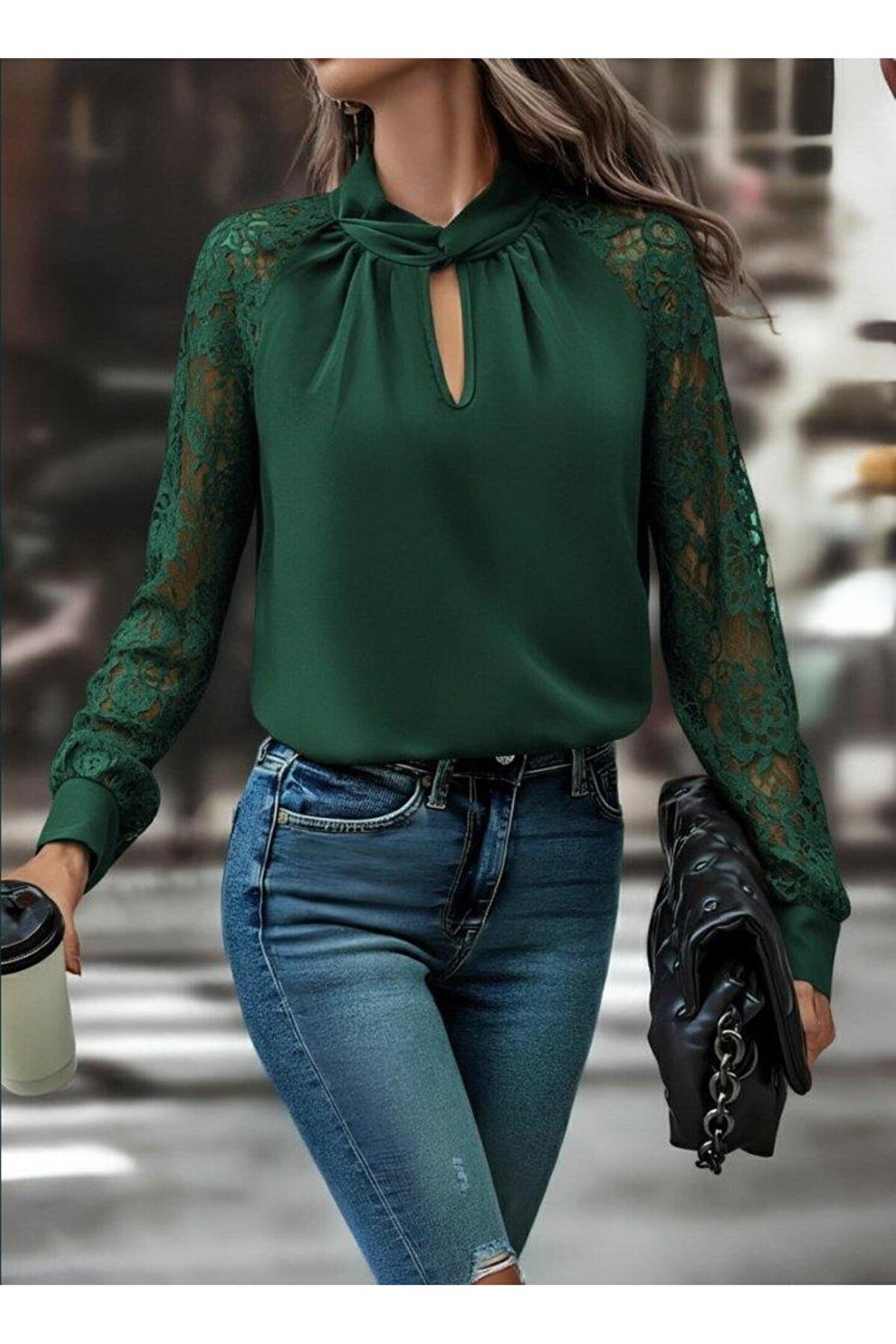 Butik Kadın Uzun Kollu Yaka Düğme Detay Güpürlü Kol Krep Bluz