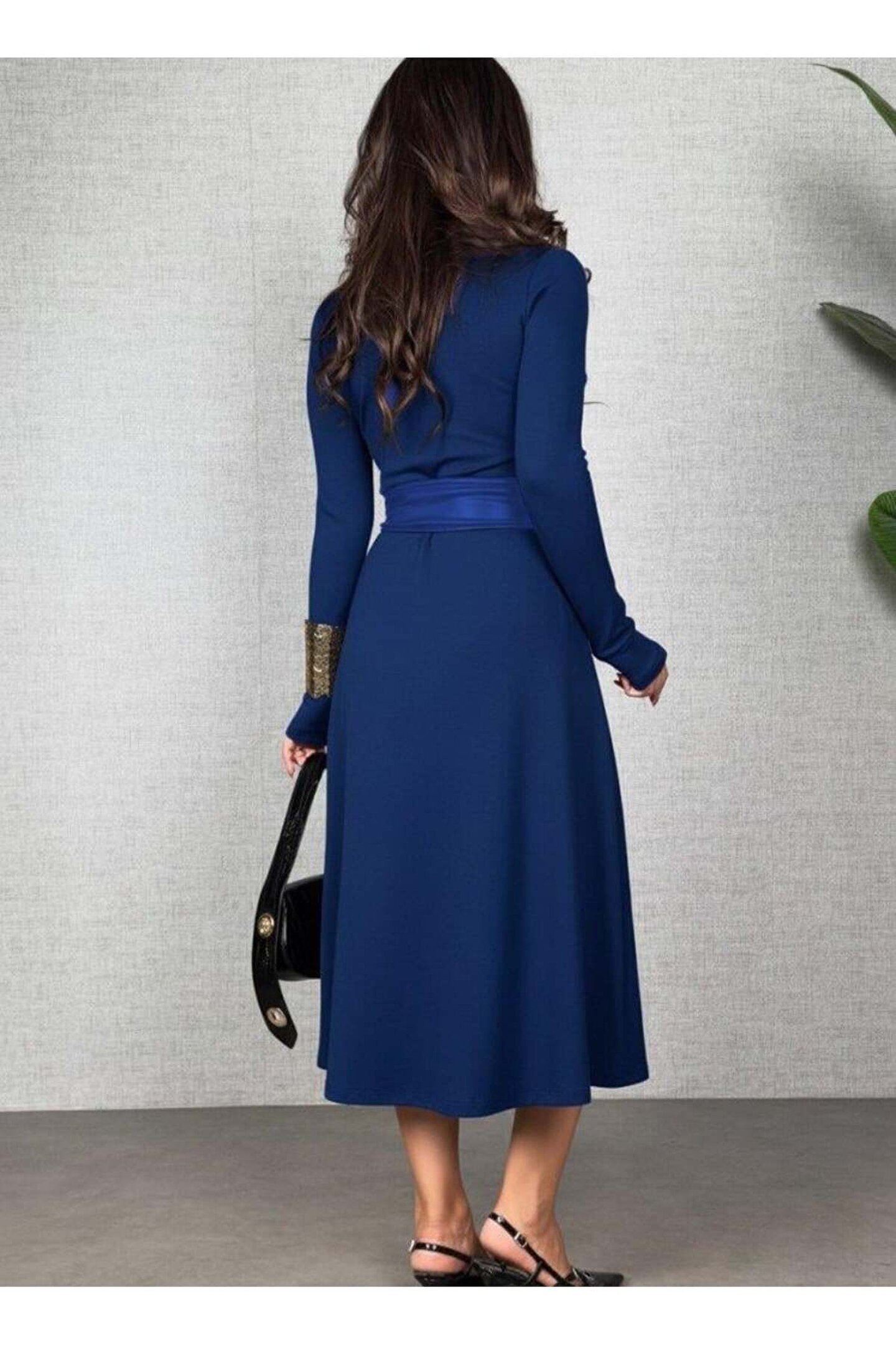 Kadın Uzun Kollu Yakalı Belden Deri Detaylı Kuşaklı Yırtmaçlı Midi Viskon Iki Iplik Elbise