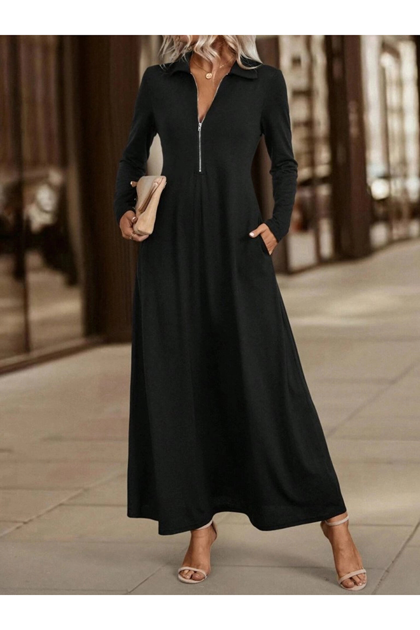 Kadın Uzun Kollu Yakalı önden Fermuarlı Uzun Viskon Iki Iplik Elbise
