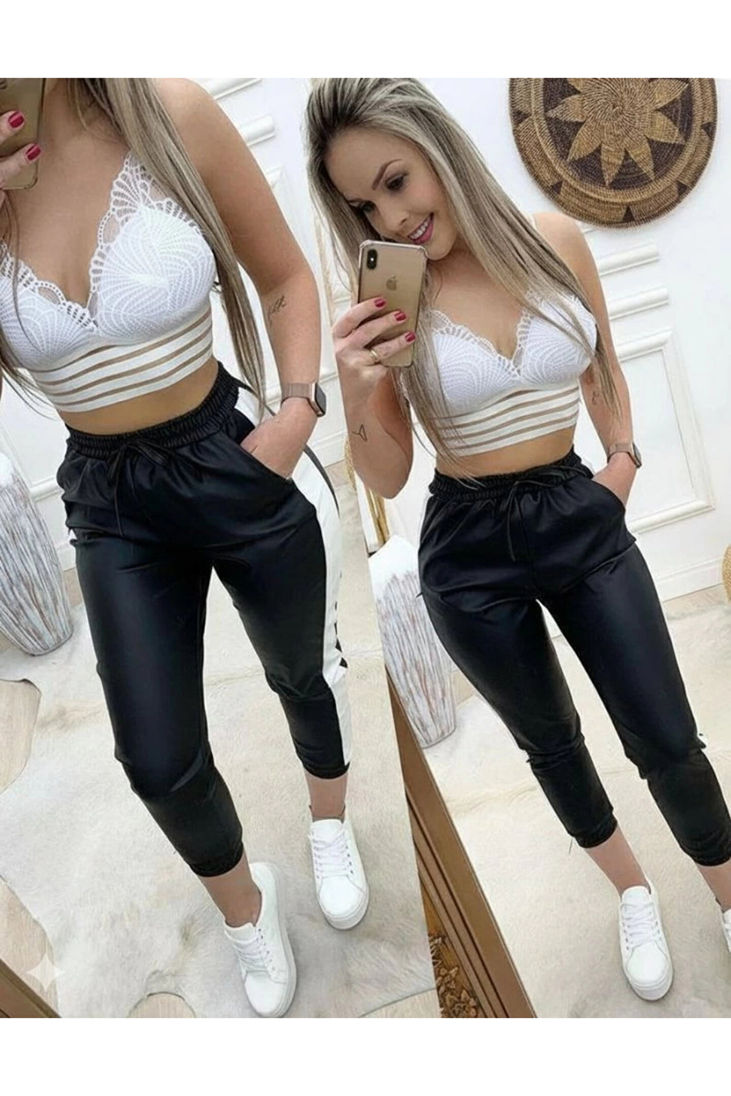 Butik MDB Kadın Yüksek Bel Lastikli Yan şerit Detaylı Deri Pantolon
