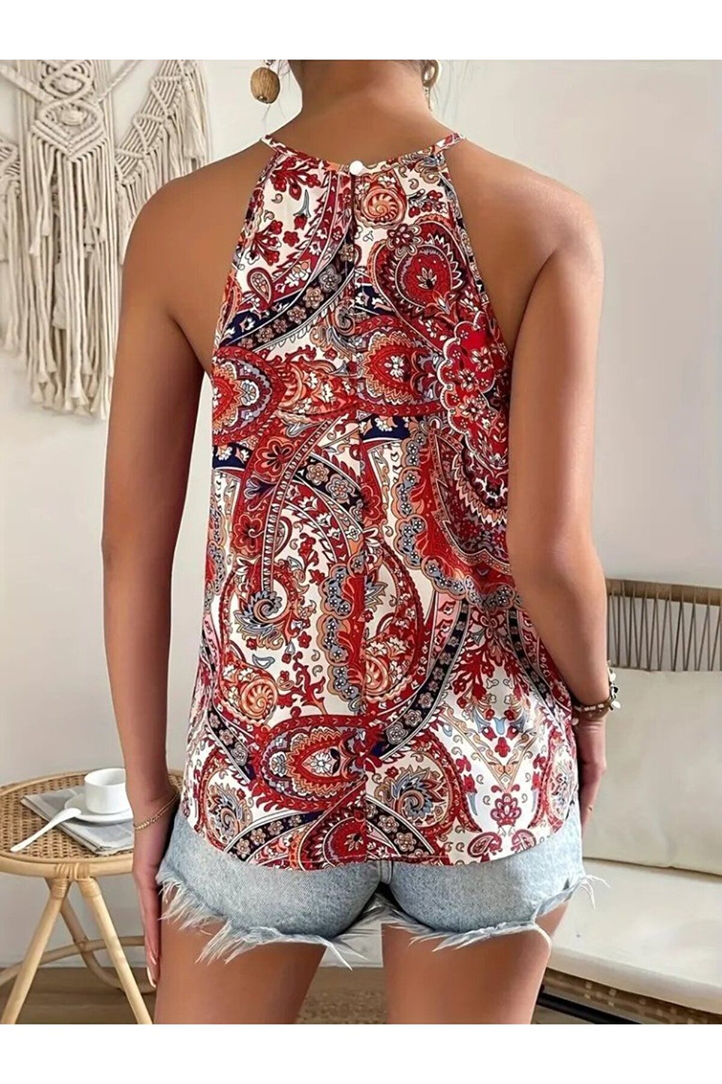 Kadın Halter Kollu Damla Detaylı Desenli Süprem Bluz