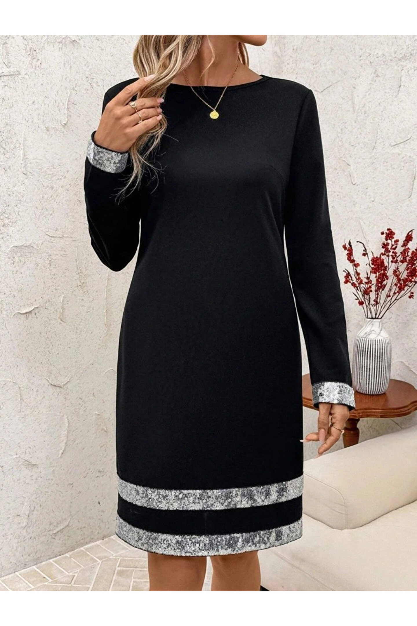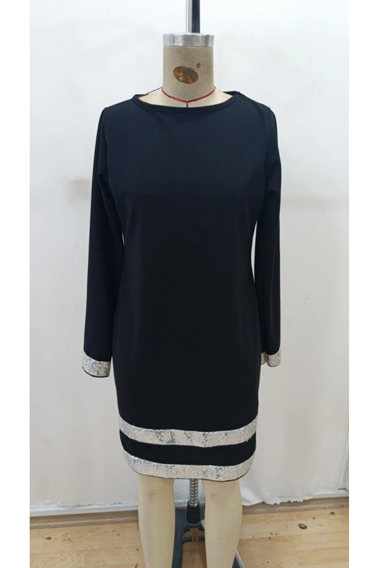 Kadın Uzun Kollu Bisiklet Yaka Mini Ithal Krep Elbise