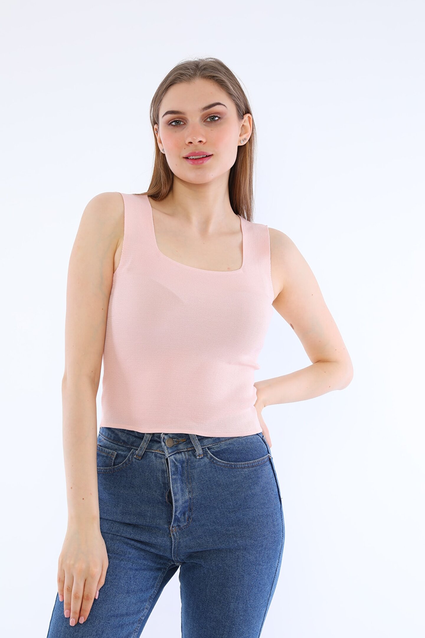 ByElits Kadın Pembe Kolsuz Bluz Kalın Askılı Atlet Ince Yazlık Kare Yaka Triko