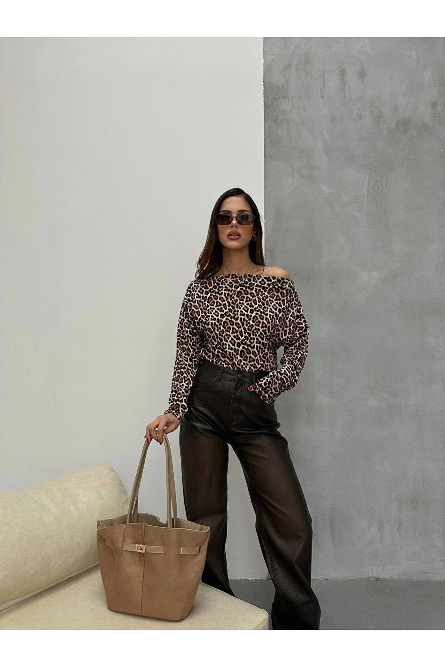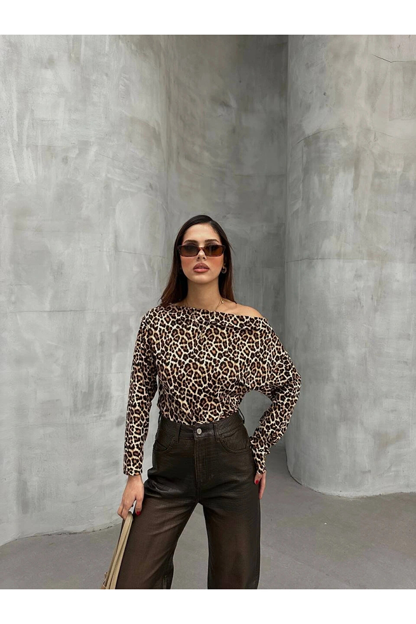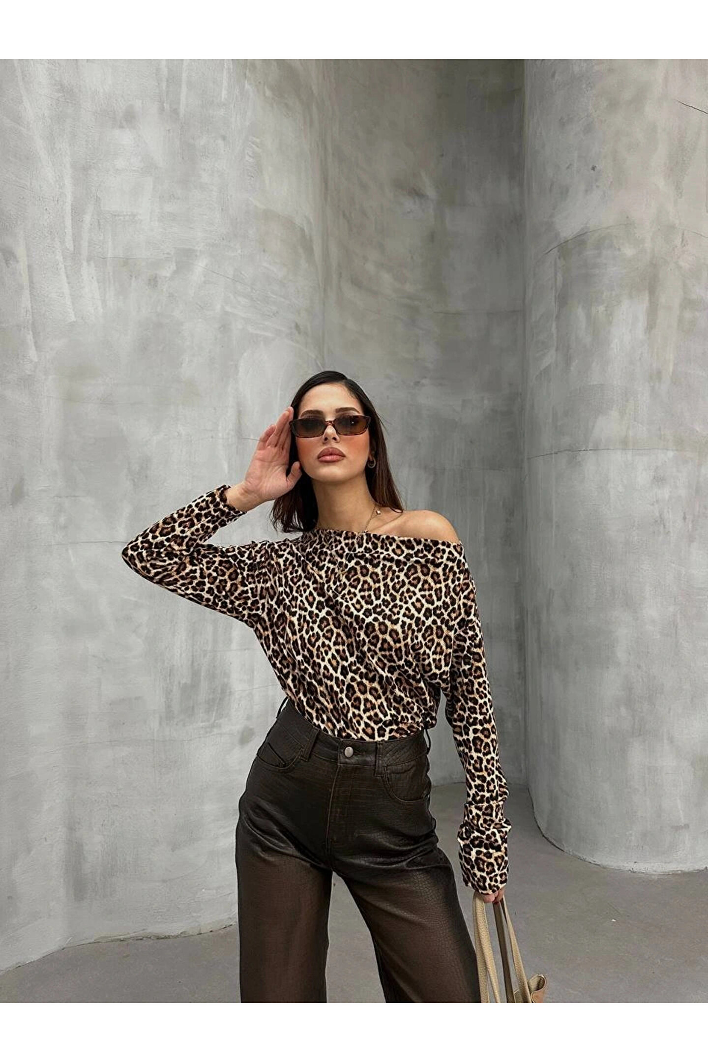 Kadın Leopar Desenli Düşük Omuzlu Bluz