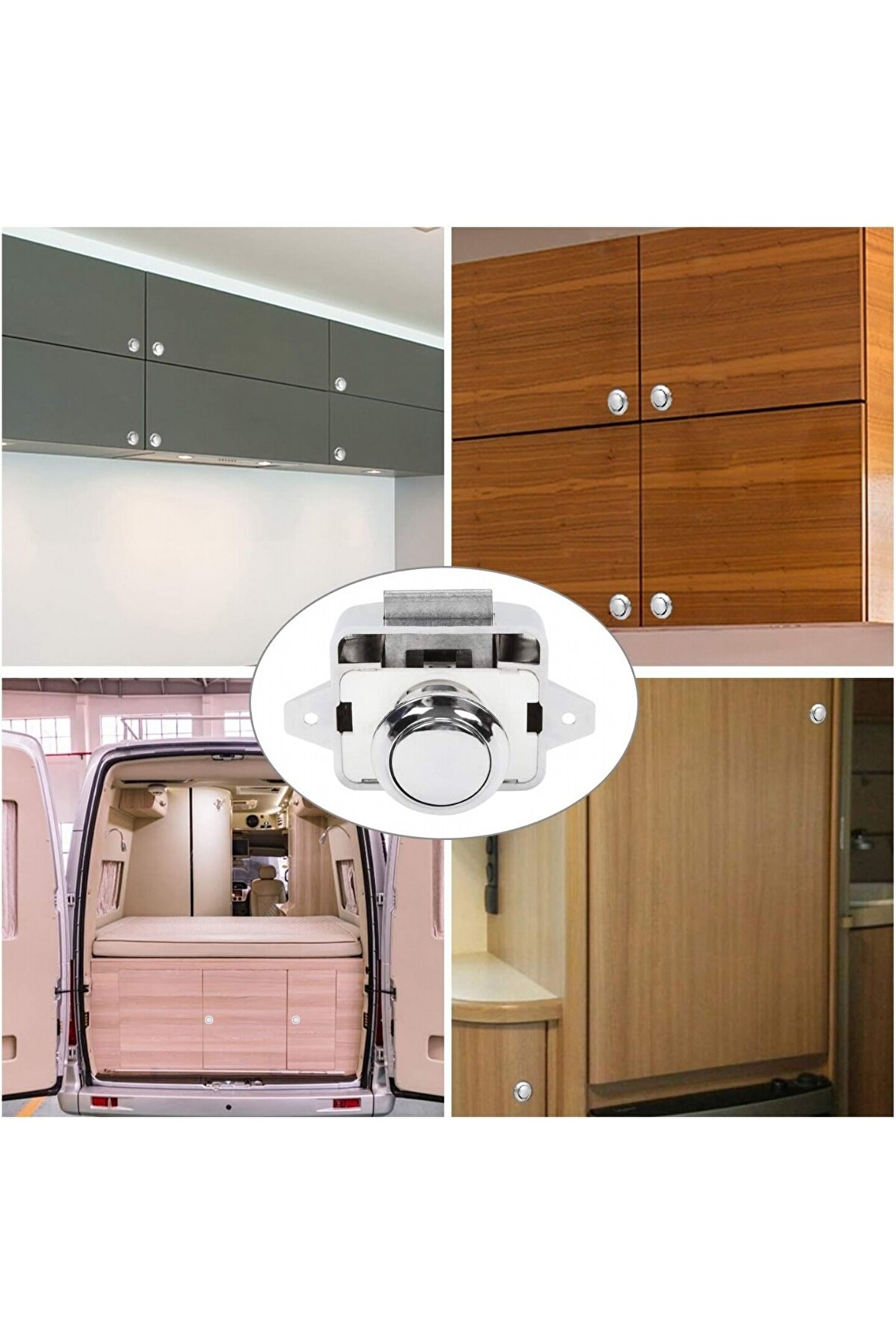 Karavan mobilyaları, dolaplar, yat/karavan çekmeceleri, tekne masaları, dolap kapıları, duvar dolapları vb. için kullanılır.; Özellikler - 26 mm çaplı dolap kapısı delikleri ve 15 ila 18 mm çoğu dolap kapısı/çekmecesinin kalınlığı için uygundur. Sabitleme vidası mesafesi: 64,62 mm.; Malzeme – Ağırlıklı olarak ABS plastik kabuk. Kilit silindiri çinko alaşımdan oluşur.; Paket içeriği: 1 adet çıtçıt kilit. Her biri 4 x vida ve 1 x emniyet sacı.;