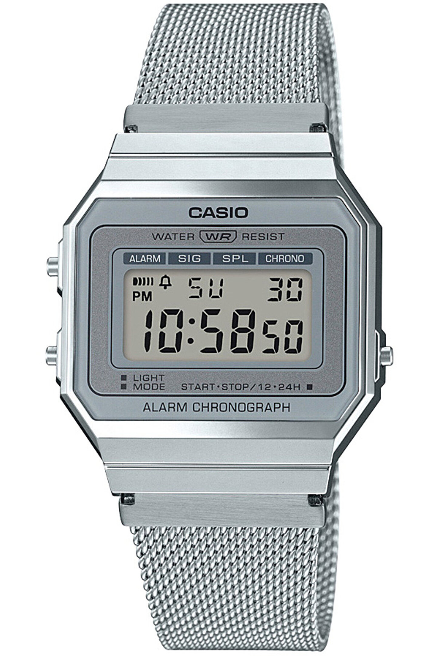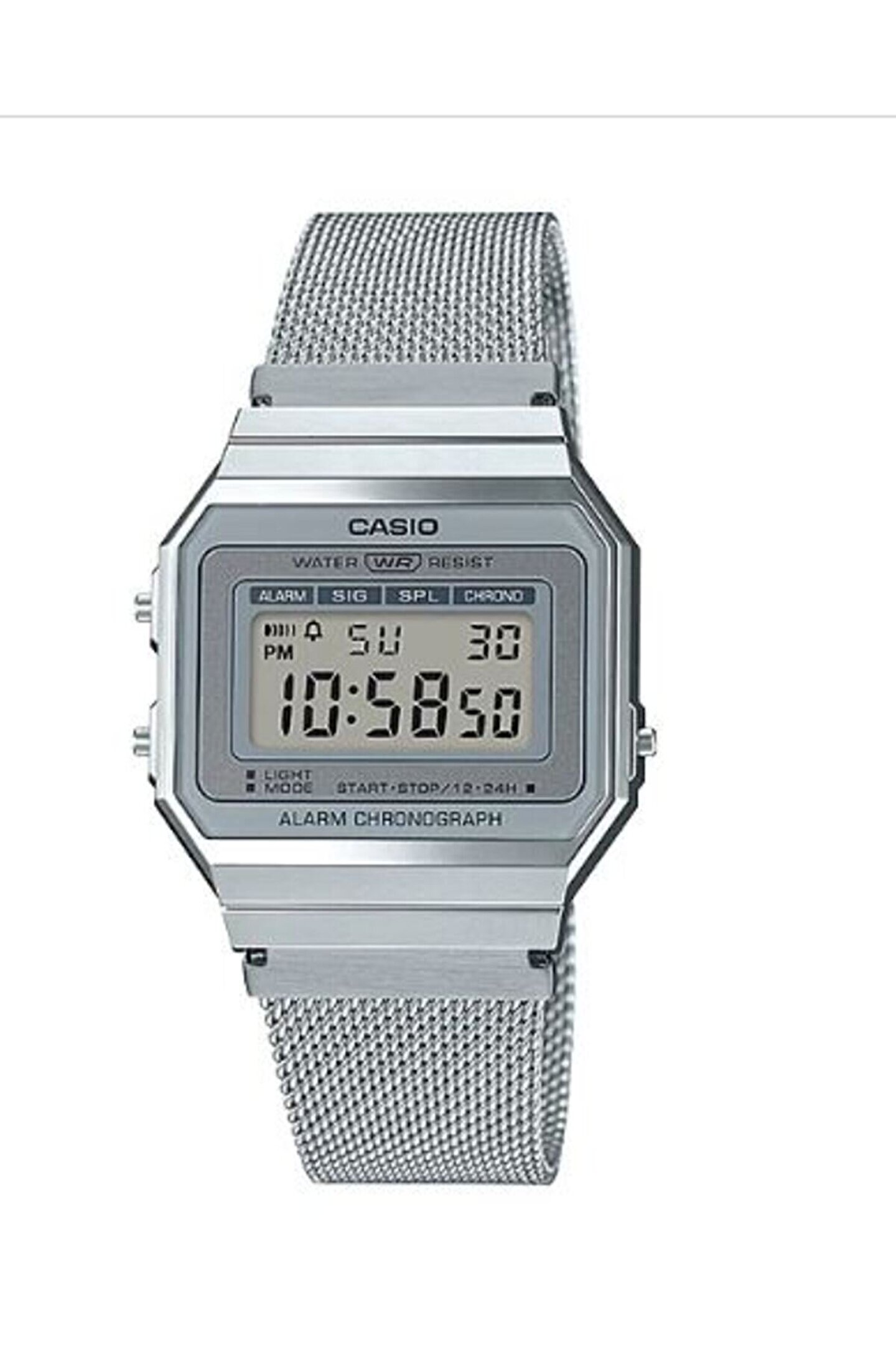 Vintage Koleksiyonu SÜPER İNCE GÖVDE Su geçirmez LED arka ışık 1/100 saniye hassasiyetli kronometre Günlük alarm Paslanmaz çelik kordon Gövde / çerçeve malzemesi: Silikon Ayarlanabilir Toka Paslanmaz Çelik Örgü Kordon Mineral Cam Su Geçirmez LED arka ışık 1/100 saniye hassasiyetli kronometre Ölçüm kapasitesi: 59'59.99'' Ölçüm modları: Bölüm süresi, 1. ve 2. gelenlerin süreleri Günlük alarm Saat sinyali Otomatik takvim (Şubat için 28 güne ayarlı) 12/24 saat biçimi Normal saat işlemleri: Dijital: Saat, dakika, saniye, pm, tarih, gün Doğruluk: ±30 saniye/ay Yaklaşık pil ömrü: CR1616 ile 3 yıl Gövde boyutu : 37,4×35,5×6mm Toplam ağırlık : 53g