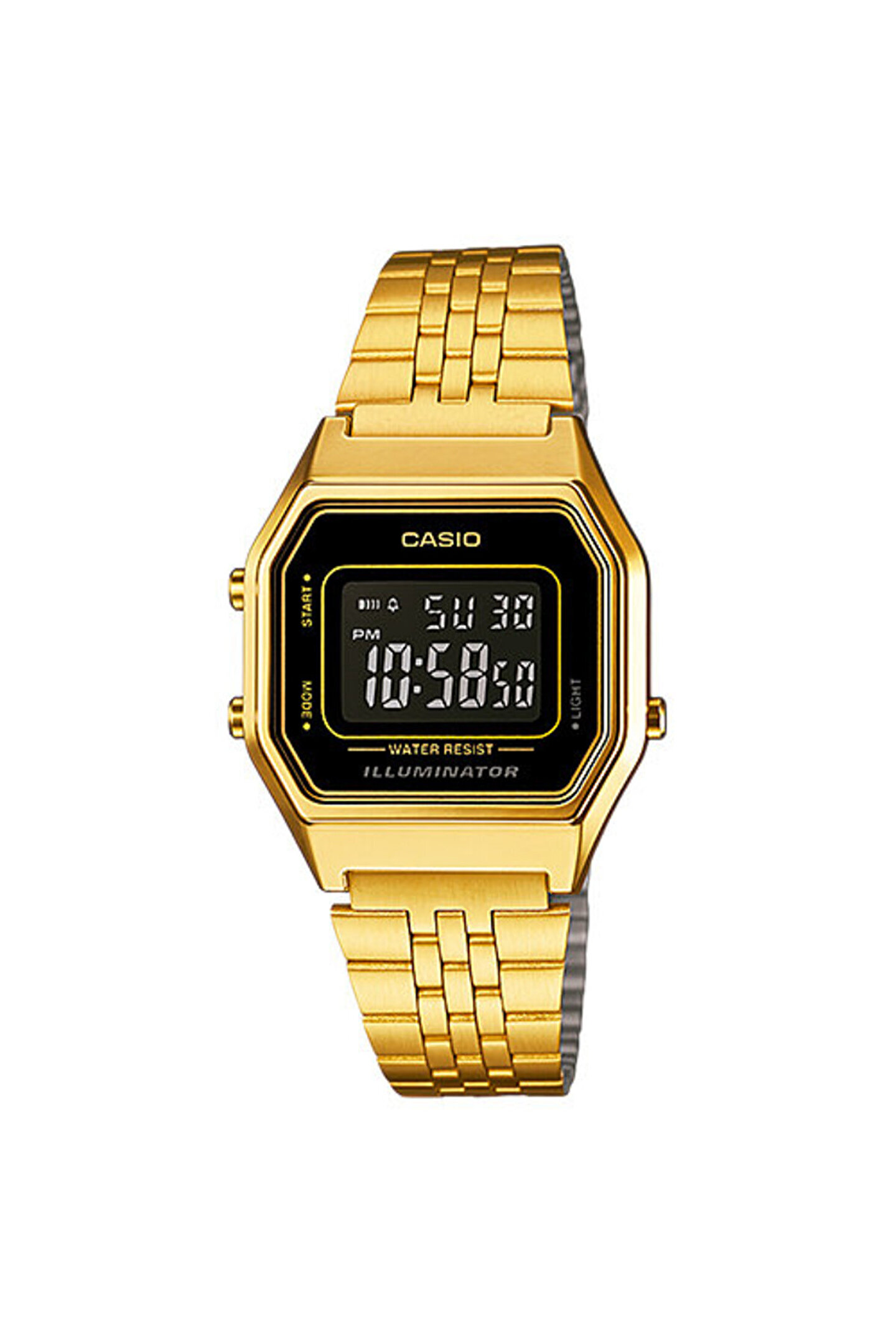 Özellikler • 1/100 saniye hassasiyetli kronometre • Alarm • LED ışığı • Su geçirmez • Paslanmaz çelik kordon • Popüler retro tasarım Teknik Özellikler Silikon Cam Su Geçirmez Gövde / çerçeve malzemesi: Silikon / Taklit altın Paslanmaz Çelik Kordon Ayarlanabilir Toka LED ışık 1/100 saniye hassasiyetli kronometre Ölçüm kapasitesi: 59'59.99" Ölçüm modları: Geçen süre, bölüm süresi, 1. ve 2. gelenlerin süreleri Günlük alarm Saat sinyali Otomatik takvim (Şubat için 28 gün) 12/24 saat biçimi Normal saat işlemleri: Saat, dakika, saniye, pm, tarih, gün Hassasiyet: ±30 saniye/ay Yaklaşık pil ömrü: CR1616 ile 5 yıl Kılıf boyutu: 33,5 × 28,6 × 8,6 mm Toplam ağırlık: 36 g LED: Koyu Kahverengi