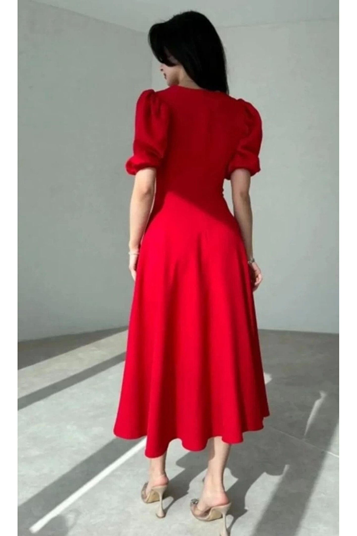 Kadın Kısa Balon Kollu Bisiklet Yaka Geniş Kesim Janjan Krep Elbise