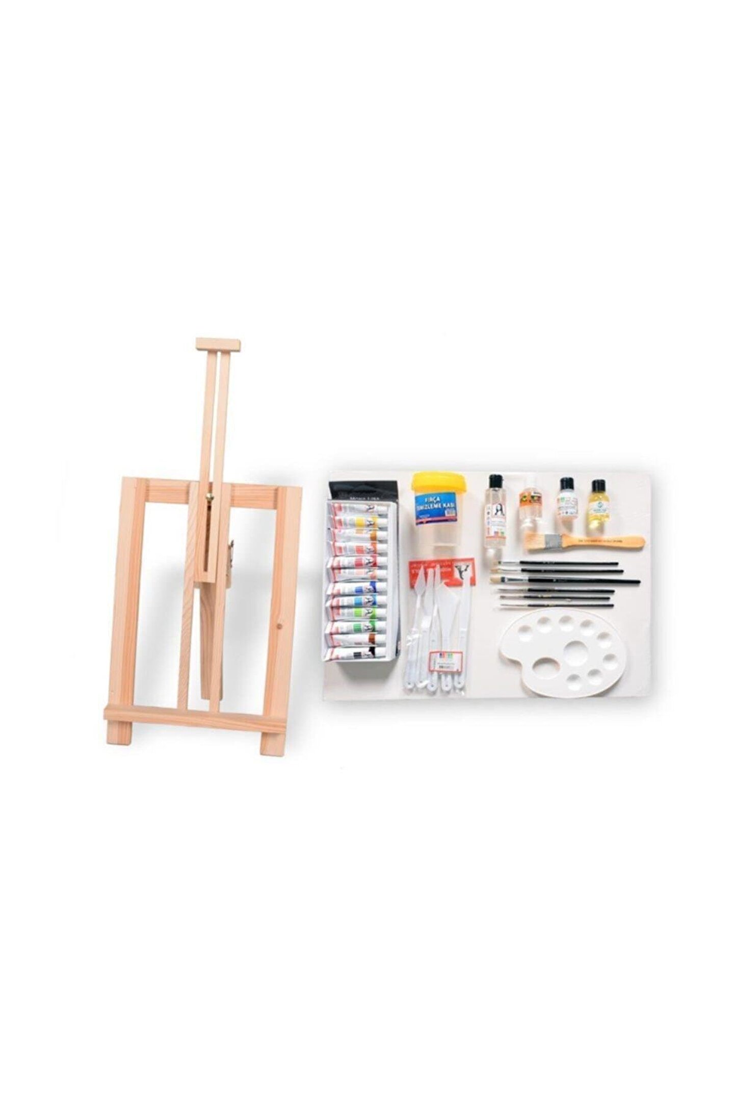 Yağlı boya başlangıi seti masa üstü masa üstü şövale gürgen tuval 35x50 cm monalisa yağlı boya 12 renk x 12 tüp kokusuz terebentin 25ml.; Resim yağı keten yağı 25ml.; Resim verniği 25ml.; Fırça temizleyici jel 70ml.; Palet plastik 8 göz 20 cm sivri uç fırça seti no:1-3-5 yassı uç fırça seti no:2-4-6 zemin fırça no:3 spatül plastik 5li set fırça temizleme kabı ;
