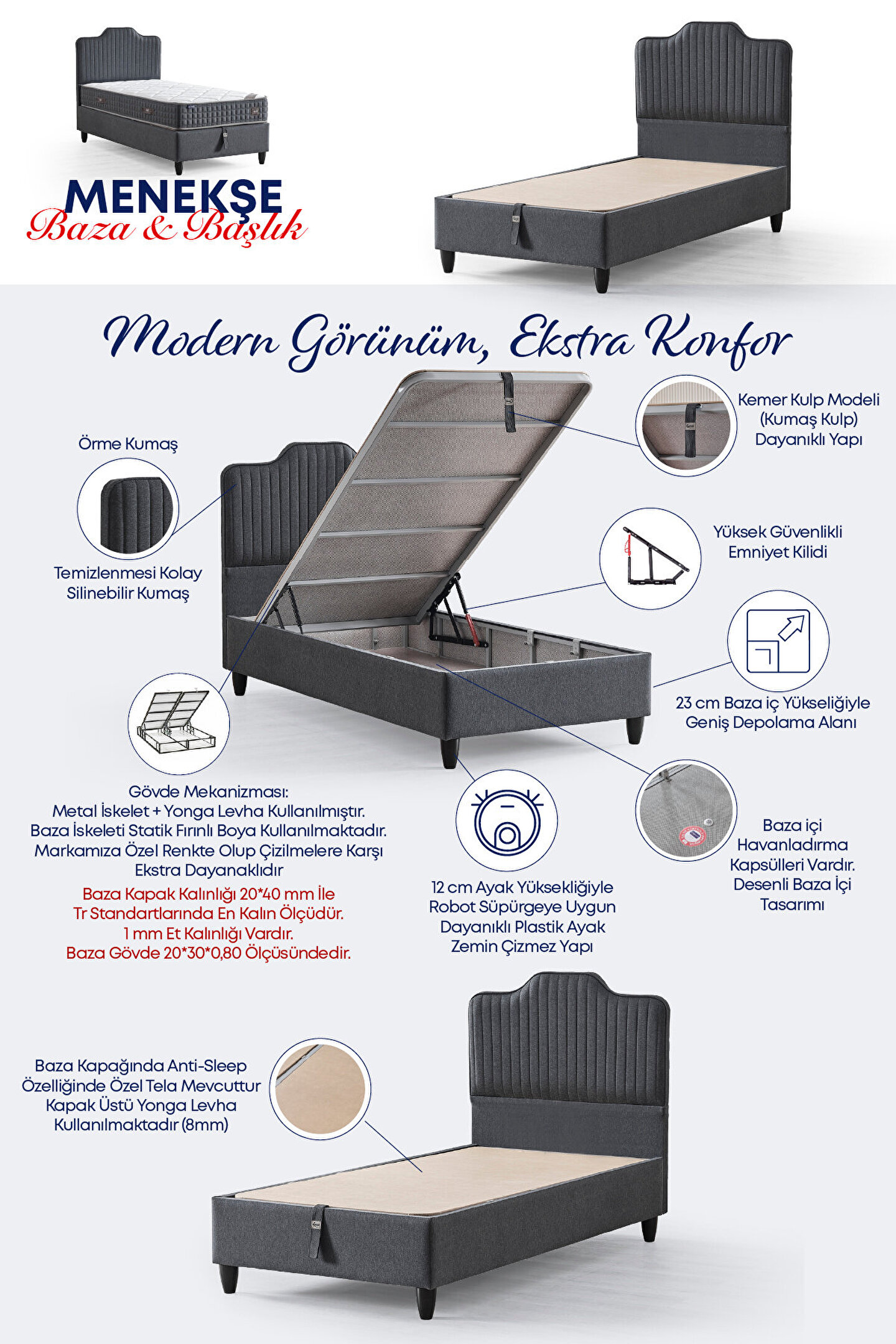Tek Kişilik Menekşe Başlık & Baza Takımı & Yatak 3 lü Set Menekşe Başlık Özellikleri Kumaş ve Konfor Kumaş Türü: Keten kumaş Özellik: Sünger dolgulu ve kolay silinebilir yapı Ölçüler Yükseklik (Boy): 101 cm Derinlik: 7 cm Menekşe Baza Özellikleri Kumaş ve Malzeme Kumaş Türü: Nefes alabilen keten kumaş Çevresi: Sünger dolgulu, kolay silinebilir yüzey Kapak Kalınlığı: 20x40 mm (TR standartlarında en kalın ölçü) Kapak Üstü : Kaydırmaz Tela Kullanılmıştır Et Kalınlığı: 1 mm Gövde Ölçüsü: 20x30x0.80 mm İskelet: Statik fırınlı boya, çizilmeye karşı ekstra dayanıklı ve markaya özel renkte Teknik Detaylar Baza Tipi: Sandıklı baza Depolama Alanı: 23 cm iç yükseklik Kulp Tipi: Kemer model kumaş kulp Ayak Yüksekliği: 12 cm (robot süpürge uyumlu) Gövde Mekanizması: Metal iskelet + yonga levha Güvenlik ve Dayanıklılık Emniyet: Yüksek güvenlikli emniyet kilidi Kapakta: Anti-Sleep özellikli özel tela Garanti: 2 yıl Menekşe Yatak Özellikleri Yay Tipi - Bağımsız Paket Yay Sistemi Yay: Bağımsız paket yay sistemi, her yay bağımsız çalışarak vücut hatlarınıza mükemmel uyum sağlar ve destek sunar.; Faydası: Vücudunuzun her bölgesine eşit ağırlık dağılımı yaparak omurganızı doğru pozisyonda tutar ve rahat bir uyku sağlar.; Sünger Tipi Sünger: 24 DNS ortopedik sünger, sırt ve boyun bölgesine ekstra destek verir, uzun ömürlü kullanım sağlar.; Sertlik: Orta sert Kumaş Türü Kumaş: Antibakteriyel, hava alabilen ve dayanıklı kumaş, sağlıklı ve uzun ömürlü kullanım sunar.; Yatak Yüksekliği Toplam Yükseklik: 25 cm (modele göre değişebilir) Ekstra Özellikler Kullanım: Çift taraflı kullanım ile ekstra rahatlık ve hijyen sağlar.; Temizlik: Temizlenebilir Dış yüzey ile kolay bakım Paketleme : Roll Pack şeklinde gönderilmektedir.; Yatağın tam formuna gelmesi 48 - 72 saat arasındadır Nakliye bina önü değil, kapı teslimidir.