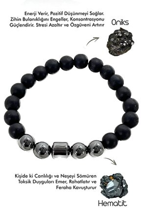 Doğal taş kullanımı sayesinde her bileklik benzersiz ve otantik bir görünüm sunar; Oniks ve hematit doğaltaşı kombinasyonu, hem şıklığı hem de zarafeti bir arada barındırır; Gençlerin enerjisine hitap eden tasarımıyla, günlük kullanımda rahatlık ve stil sağlar; Huzur ve mutluluk tılsımı olarak tasarlanmış bu bileklik, pozitif enerjilerle dolu anların vazgeçilmez aksesuarı olur;