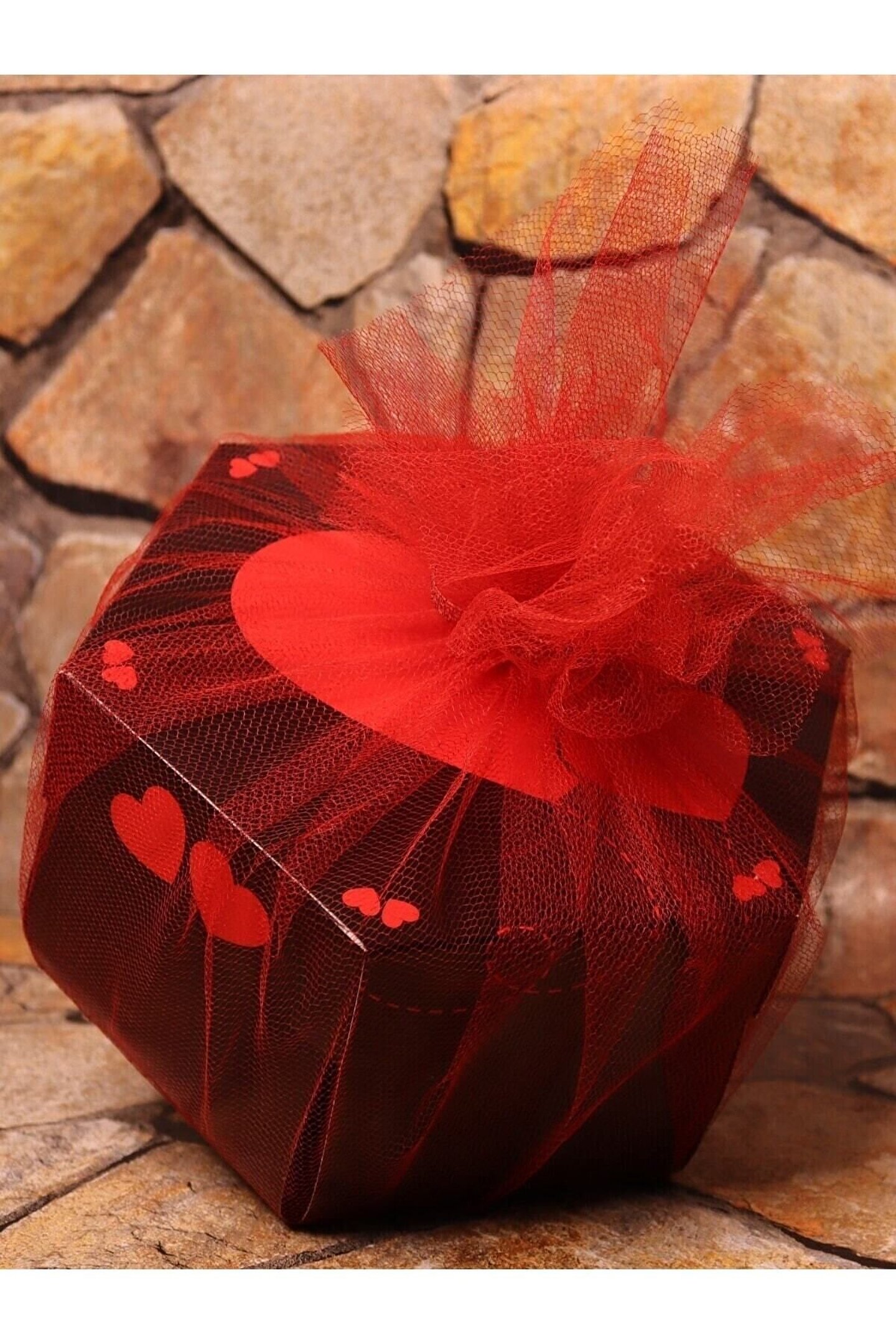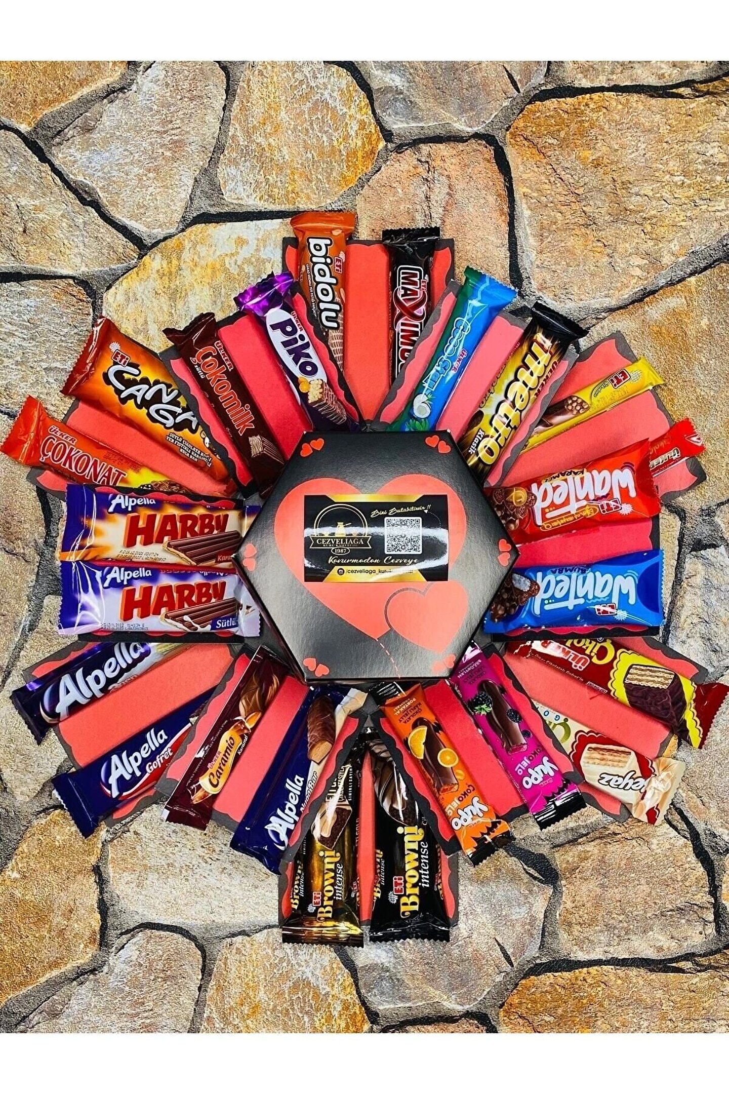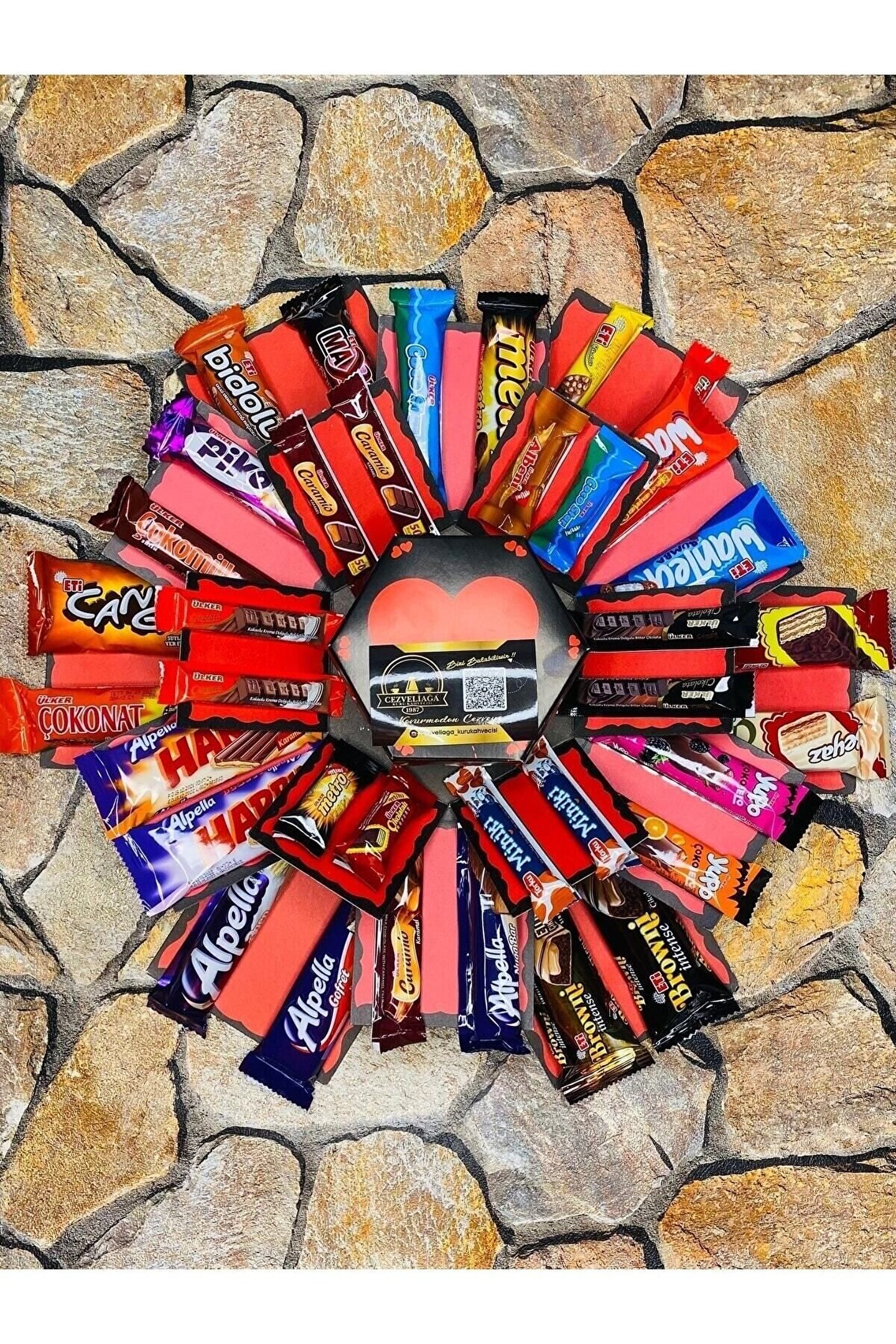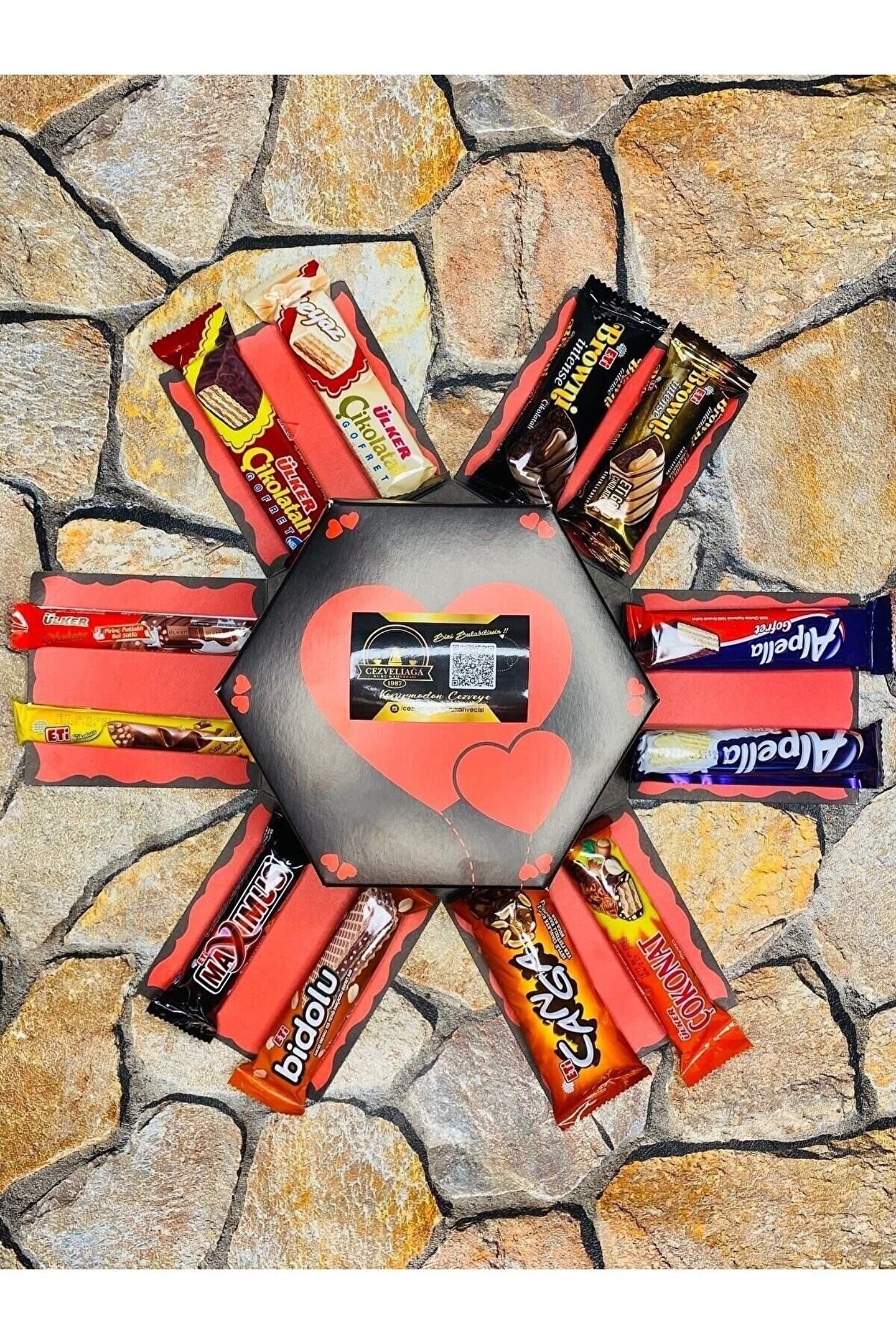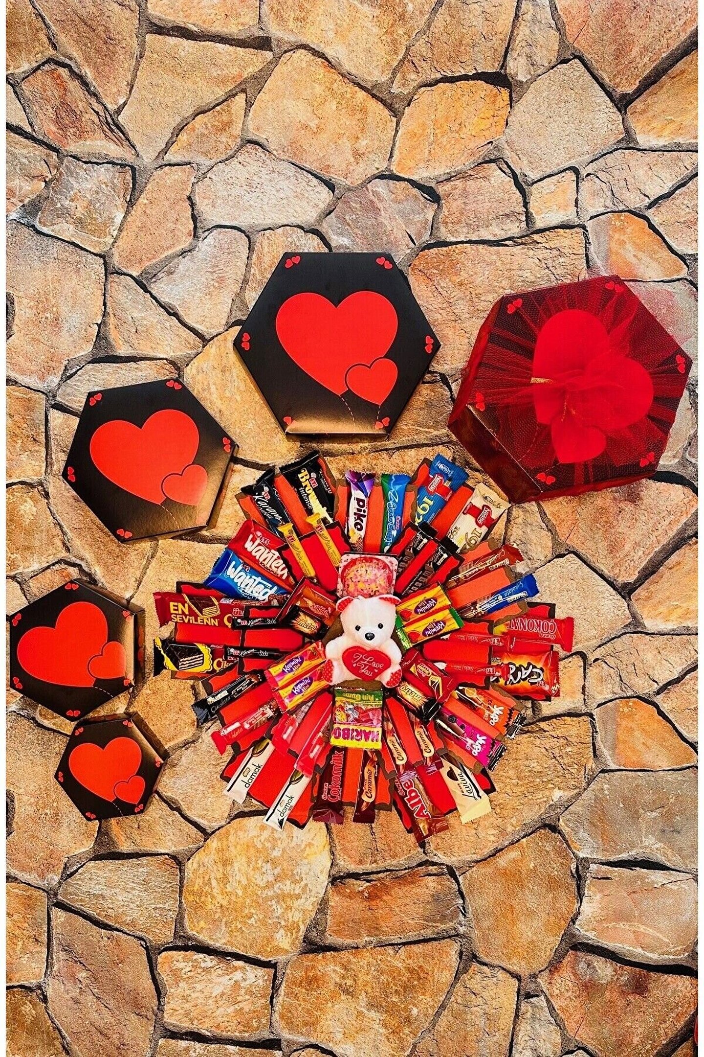 Kutu içerisinde 46 adet çikolata ve ortasında peluş oyuncak hediyemiz bulunmaktadır. ; Çikolataların hepsi markalı çikolatalar olup resimde göründüğü gibi gelmektedir. ; Hediye olarak gönderdiğimiz peluş oyuncak değişiklik gösterebilmektedir. ; Kutunun kapalı hali 22*25*14 cm altıgen şeklindedir.;