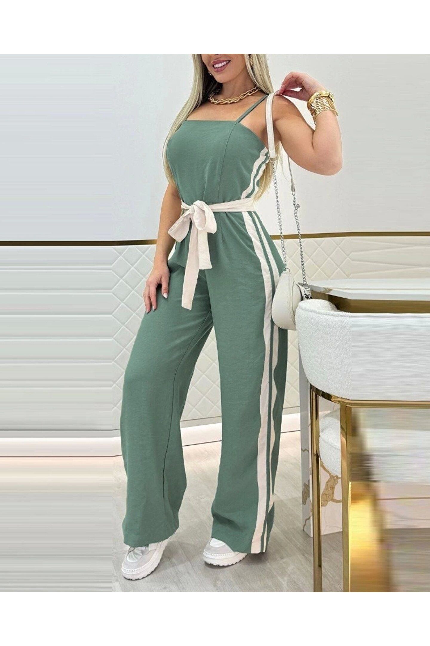 Kadın Ip Askılı Straplez Belden Kuşaklı Viskon Iki Iplik Tulum