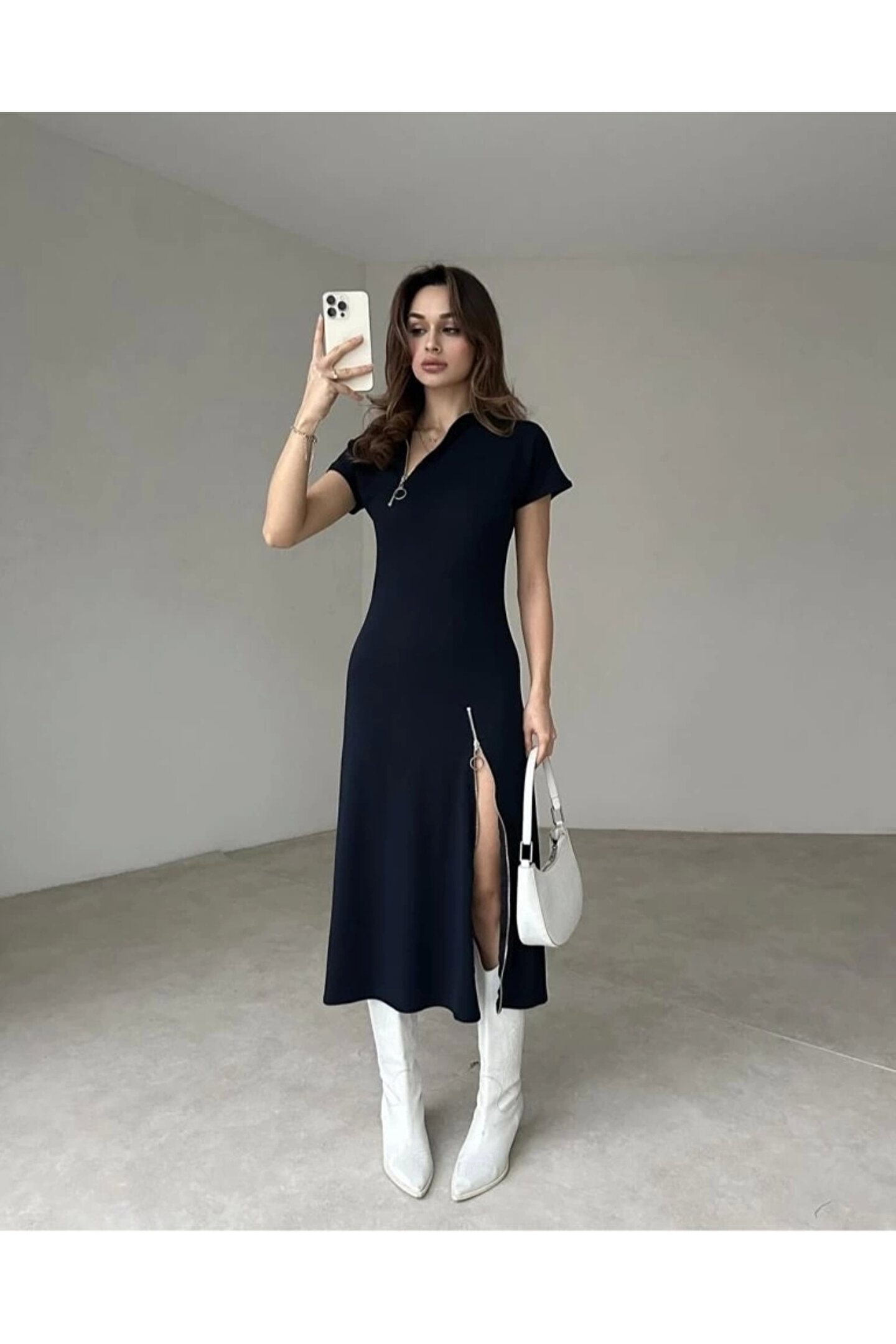 Kadın Kısa Kollu Yakadan Ve Etekten Fermuarlı Midi Viskon Iki Iplik Elbise