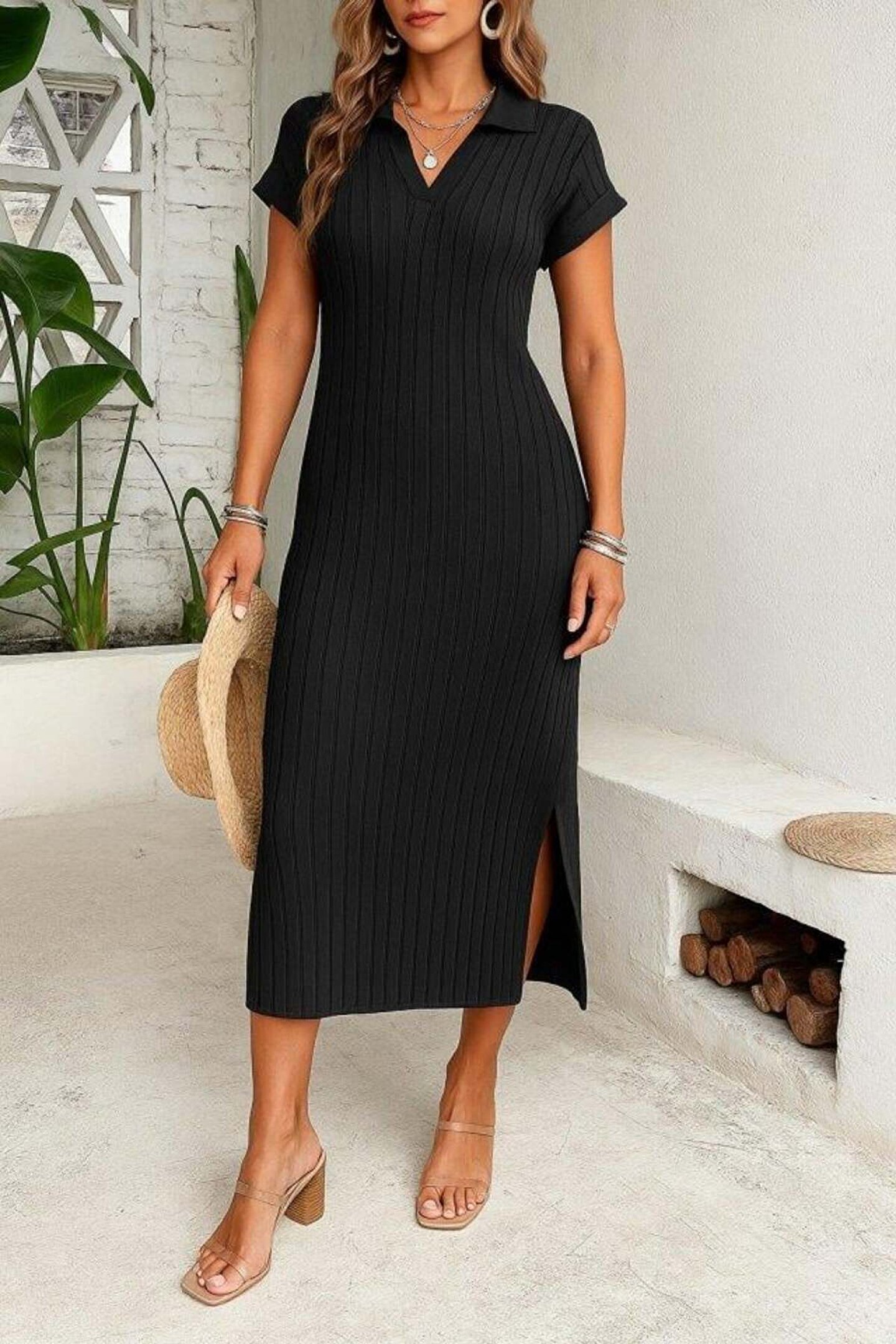 Kadın Kısa Kollu Yakalı Yandan Yırtmaçlı Kalın Fitilli Kaşkorse Elbise
