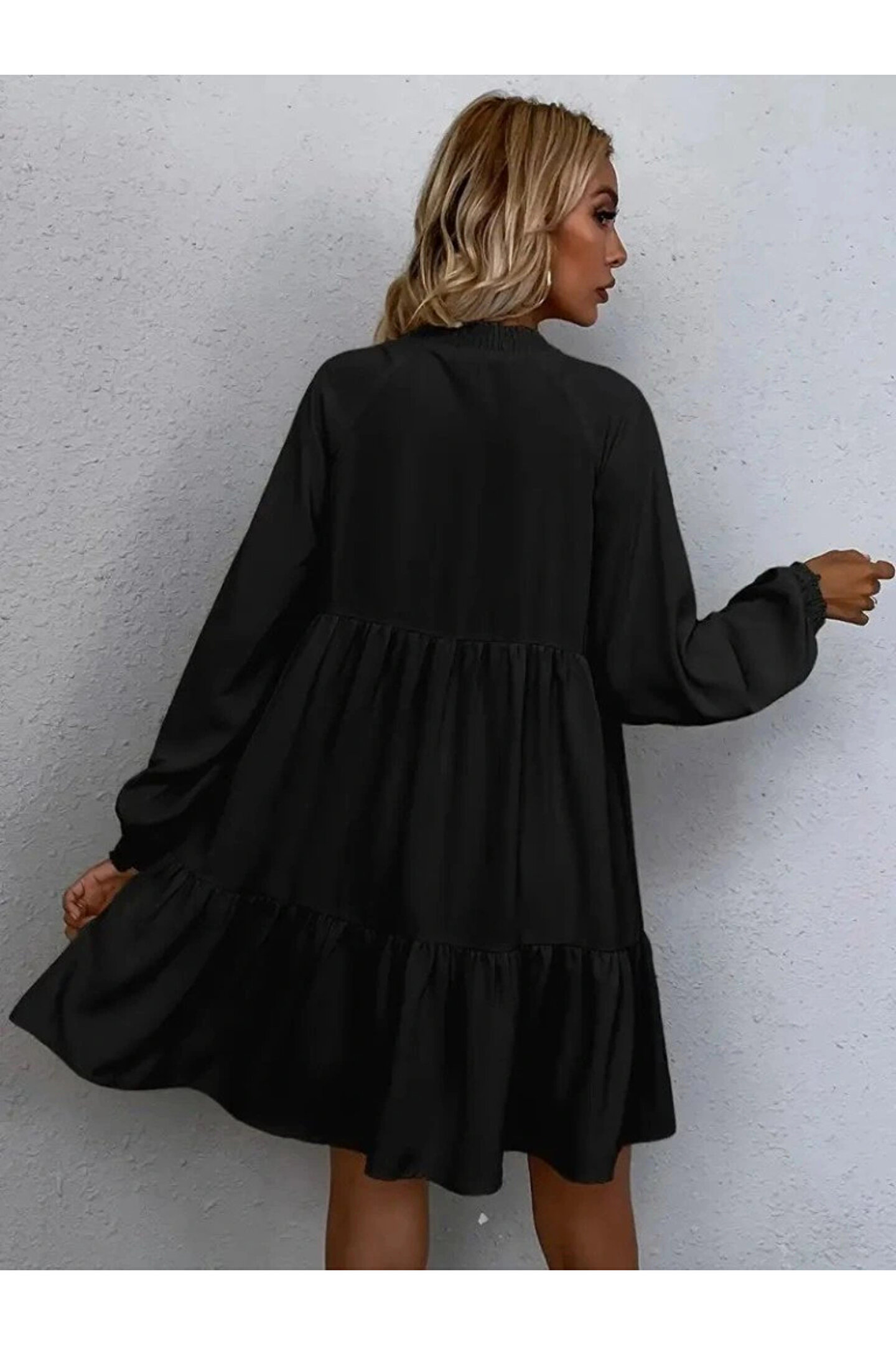 Kadın Uzun Kollu Yakadan Bağcıklı Fırfırlı Keten Mini Elbise