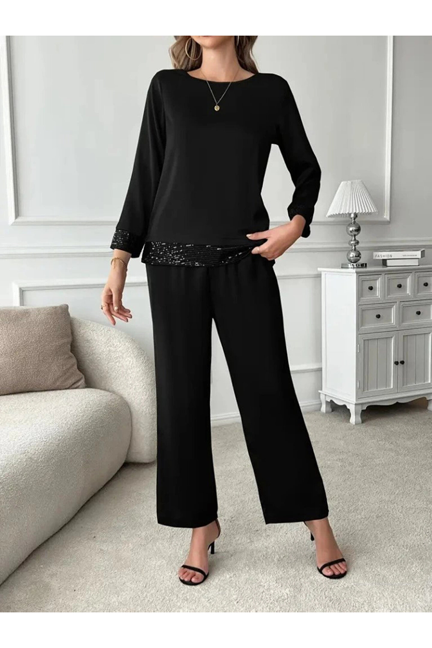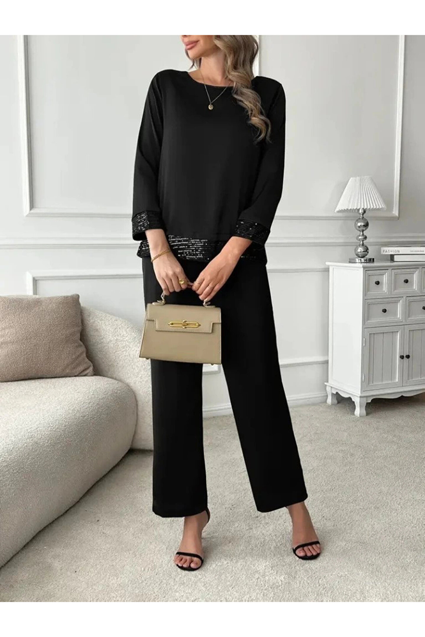 Kadın Uzun Kollu Bisiklet Yaka Pulpayetli Viskon Iki Iplik Bluz Ve Pantolon Ikili Takım