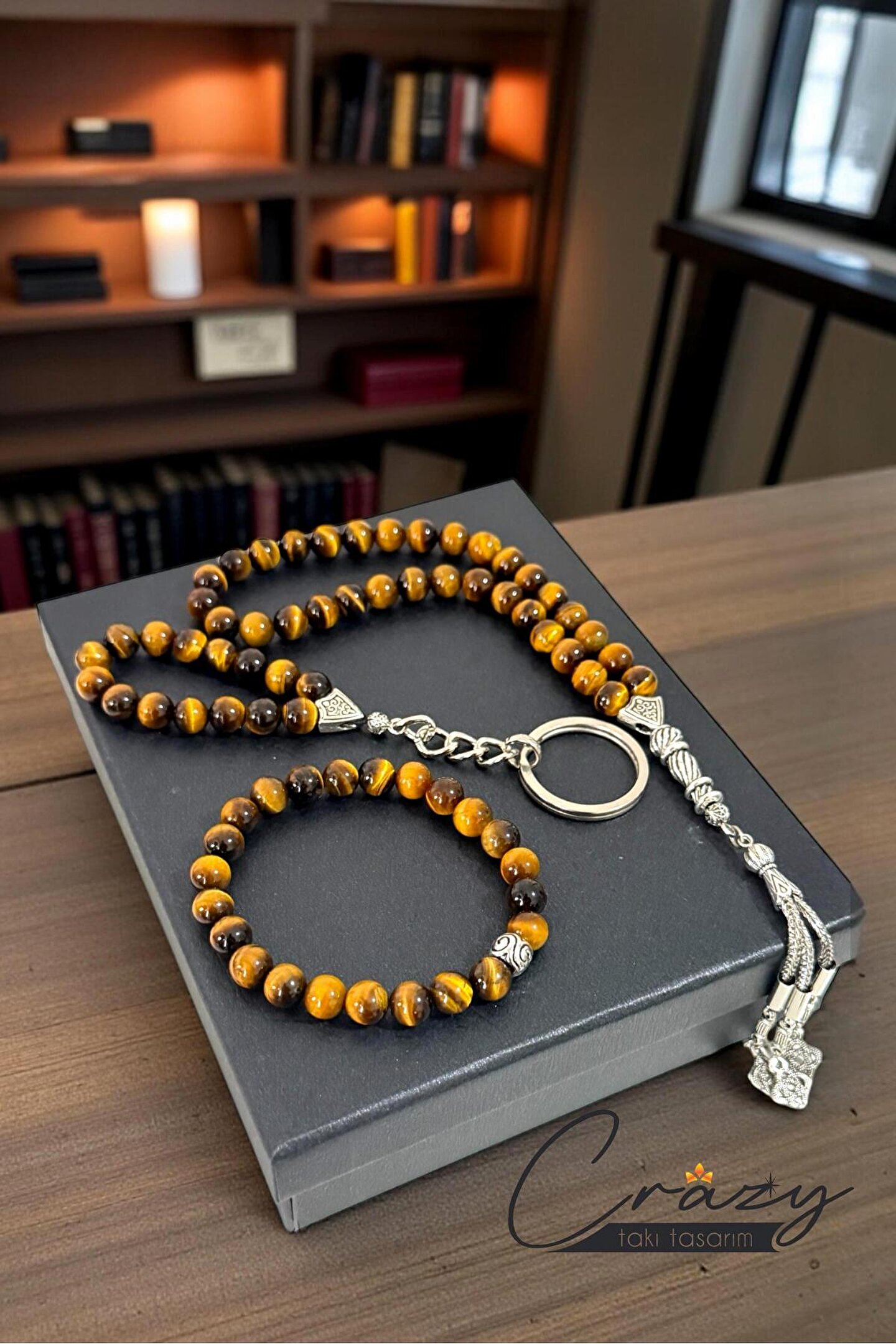 - Gümüş kaplama malzemesiyle üretilmiş, şık ve dayanıklı bir tasarıma sahiptir.; - Sarı ve siyah renk kombinasyonu ile göz alıcı bir görünüm sunar.; - 3'lü set içeriği sayesinde hem bileklik, hem tesbih hem de anahtarlık olarak kullanılabilir.; - Doğal kaplan gözü taşı ile zenginleştirilmiş, her bir parça benzersiz bir estetik sunar.; - Tek ebat tasarımı, farklı bilek ölçülerine uyum sağlayarak rahat bir kullanım imkanı tanır.; - Unisex tasarımı ile hem kadınlar hem de erkekler için ideal bir aksesuardır.; - Yetişkinler için özel olarak tasarlanmıştır, sofistike ve zarif bir aksesuar arayanlar için uygundur.