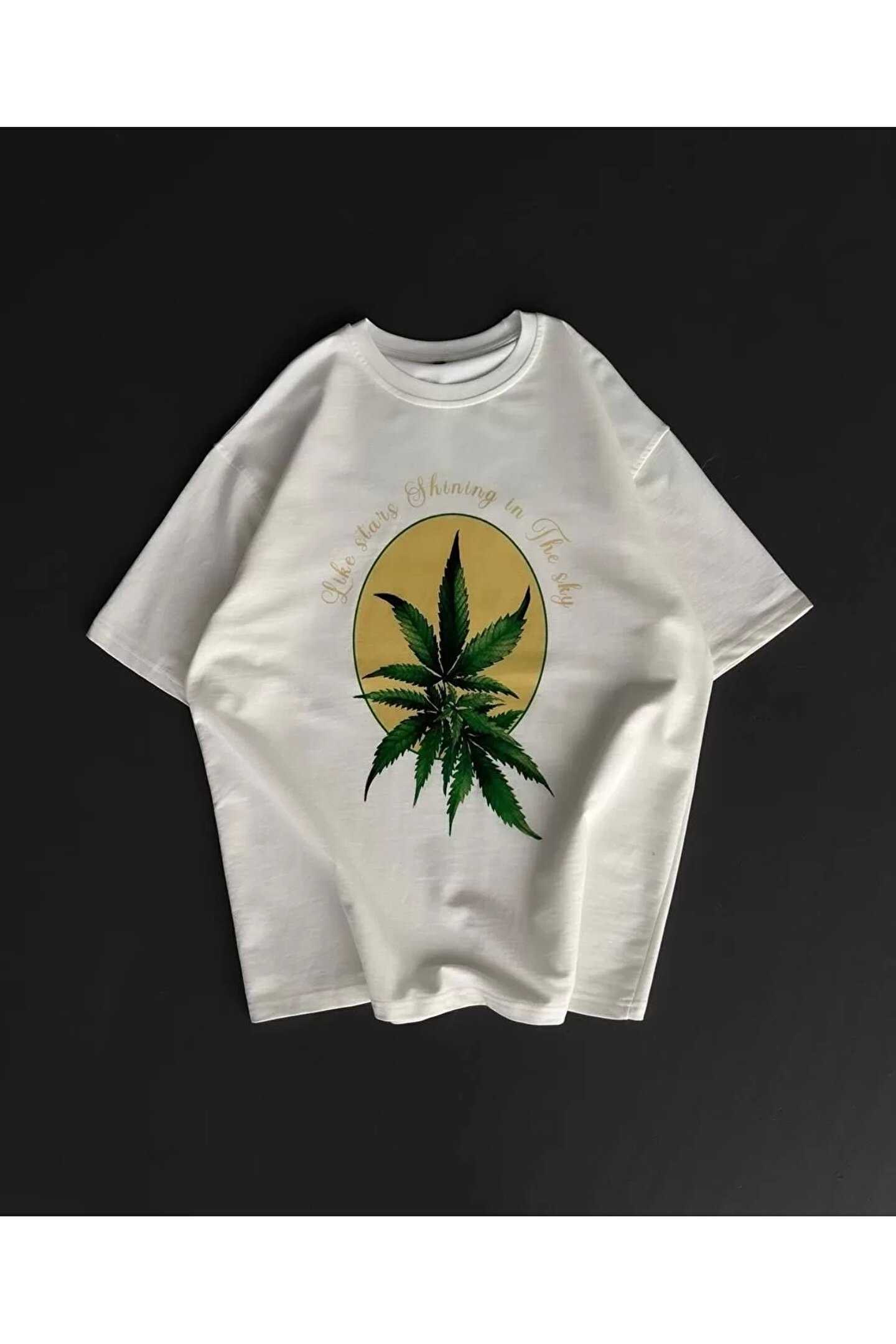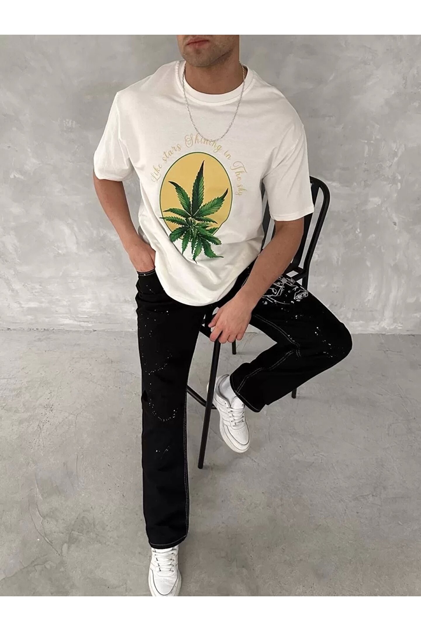 Ön Ve Arka Baskılı Oversize Bisiklet Yaka T-shirt- Beyaz