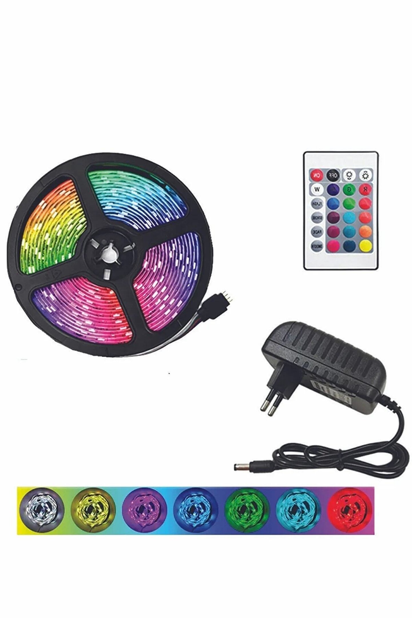 Rgb 20 fonlsyonlu Şerit 5 m Renkli Kumandalı Adaptörlü Çift Taraflı Bant Tak Çalıştır Led