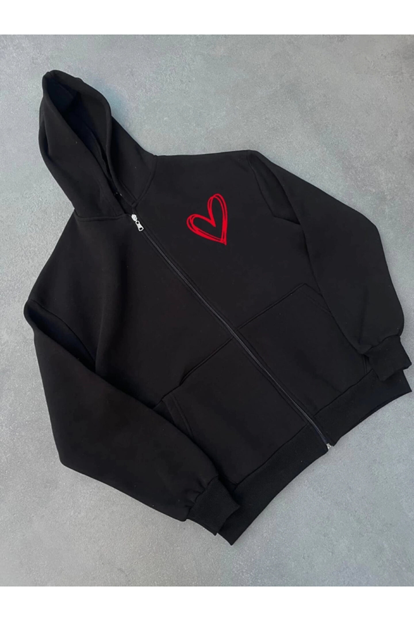Üç İplik Baskılı Fermuarlı Kapşonlu Hırka - Siyah