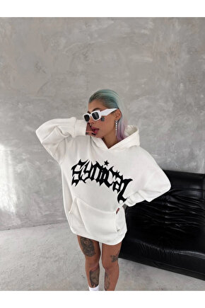 Unisex Üç İplik Kapşonlu Baskılı SweatShirt - Beyaz