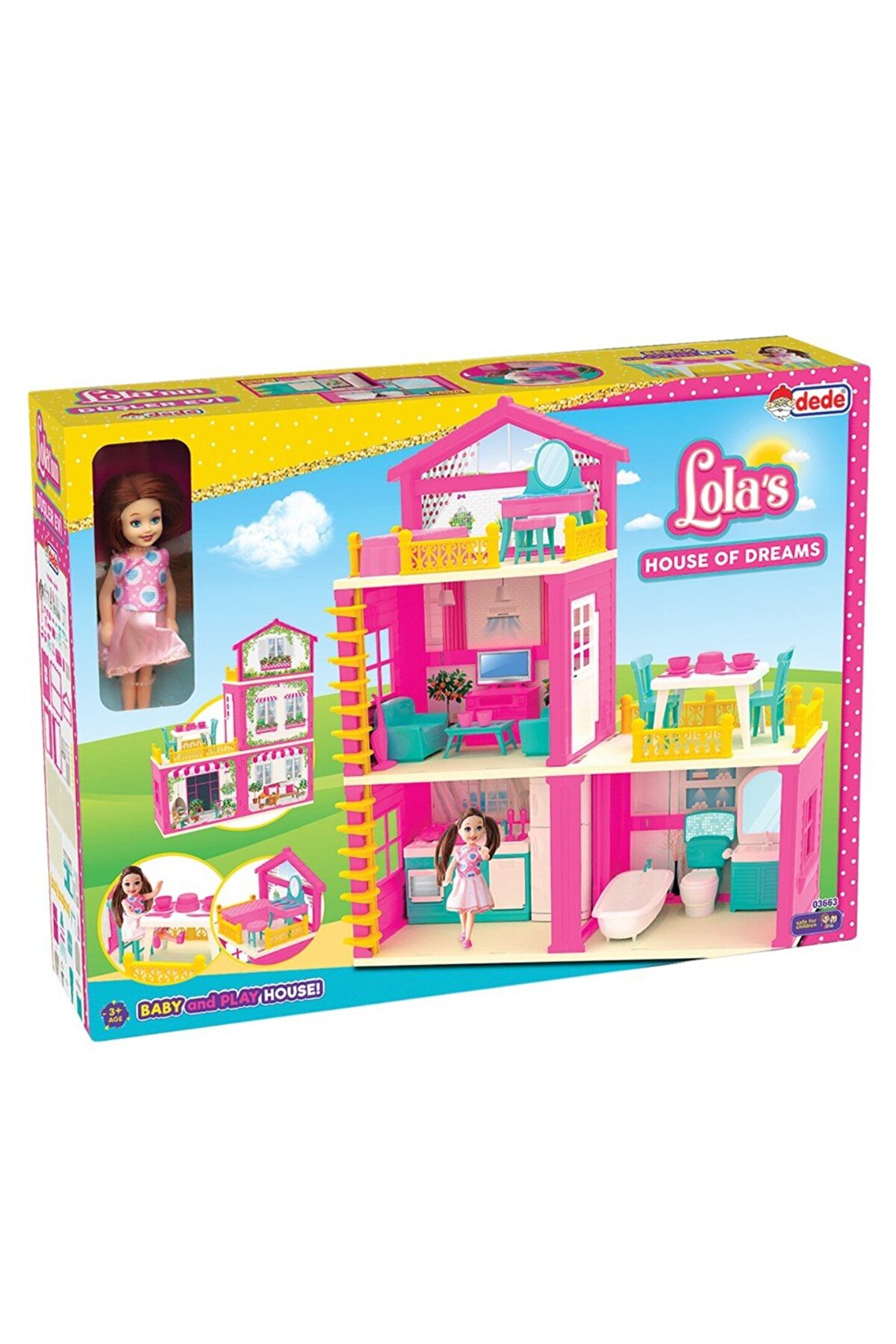 Lola'nın düşler evinde hayaller seninle gerçekleşiyor! Bu evde; yatak odası, salon, mutfak, balkon ve birde banyo bulunmakatadır.; Birçok aksesuar ile birlikte, ürün; 3 yaş altı çocuklar için uygun değildir.; Sağlık testlerinden geçmiştir.; Yerli üretimdir.